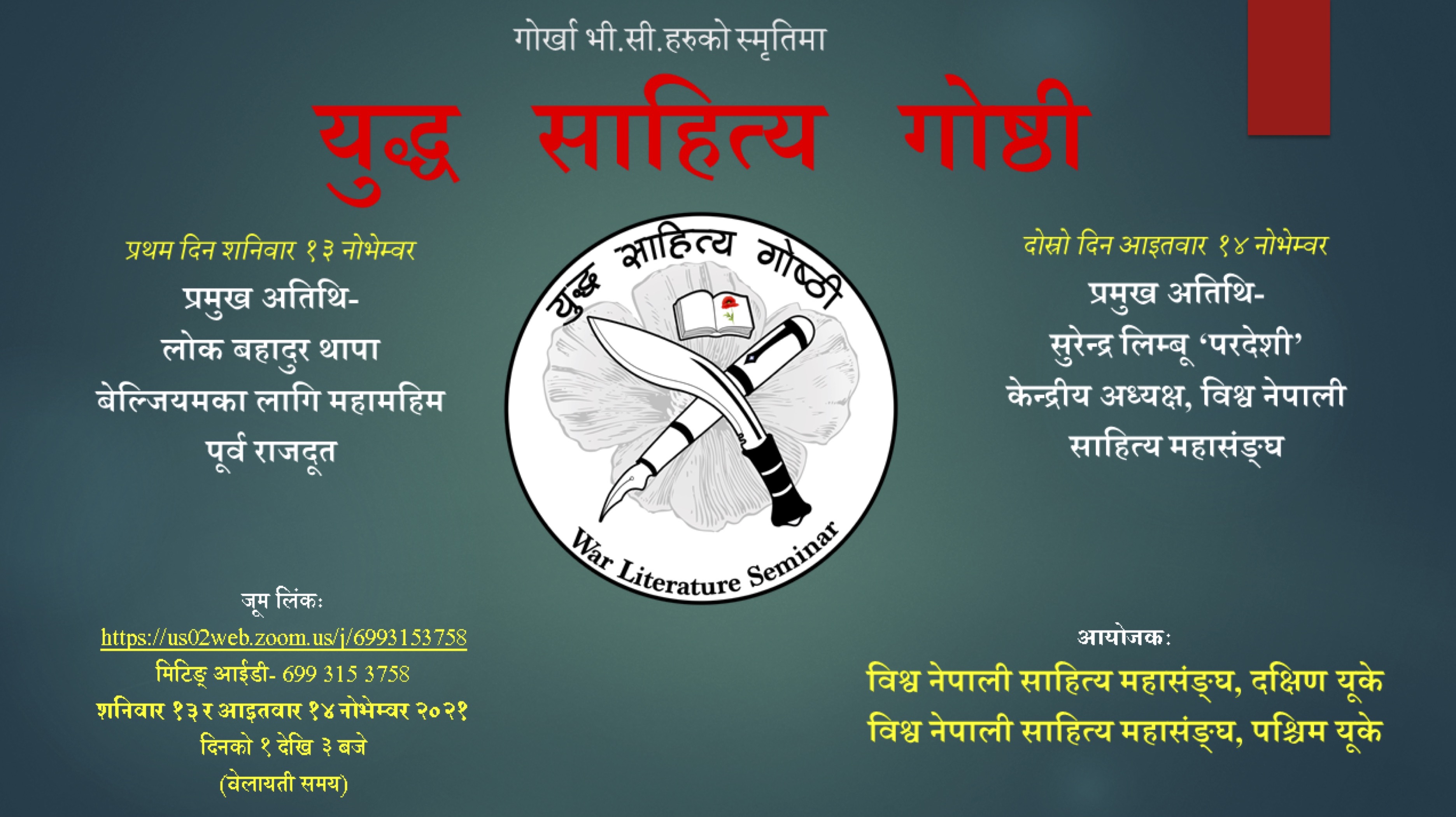 लन्डन- १३ जना गोर्खा भी.सी. को सम्झनामा जूम भर्चुवल माध्यमद्वारा युद्ध साहित्य गोष्ठी सम्पन्न भएको छ । १३ र १४ नोभेम्वर २०२१ का दिन आयोजित यस दुइ दिवसीय कार्यक्रममा आठ राष्ट्रका छ दर्जन भन्दा बढि साहित्य अनुरागिहरुको सहभागिता रहेको थियो । प्रथम दिनको कार्यक्रमका प्रमुख अतिथि बेल्जियमका लागि पुर्व राजदुत महामहिम लोकबहादुर क्षेत्रि हुनुहुन्थ्यो । वाँहा स्वयम भी.सी. शेरबहादुर थापा क्षेत्रीका नाति हुनुहुन्छ । मन्तव्यको क्रममा वाँहाले गोर्खा सम्बन्धि युद्ध साहित्यलाई साँगठानीक तरिकाले अघि बढाएर हाम्रा स्कुल तथा विश्वविध्यालयमा पढाइनु पर्छ भन्नु भयो । कार्यक्रममा भेष