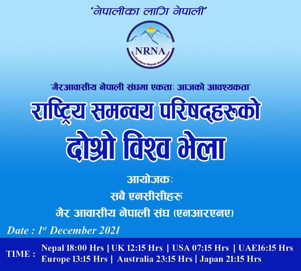 लन्डन — गैर आवासीय नेपाली संघ (एनआरएनए) राष्ट्रिय समन्वय परिषदहरुको दोश्रो विश्व भेला आउँदो बुधबार (मंगसिर १५ गते) हुने भएको छ। पहिलो विश्व भेला गत २४ अक्टोबरमा भर्चुएल माध्यमबाट आयोजना गरिएको थियो। संघभित्र विवाद बढ्दै गइ सरकार विरुद्ध मुद्दामामिला गर्न लागिएको बारे पनि भेलामा छलफल गरिने जनाइएको छ। राष्ट्रिय समन्वय परिषद (एनसीसी) अमेरिकाका अध्यक्ष तथा एनसीसीहरुको पहिलो विश्व भेला तयारी समितिका संयोजक बुद्धि सुवेदीले परराष्ट्र मन्त्रालयले संरक्षक परिषदलाई दशौँ महाधिवेशन गर्ने म्यान्डेट दिएकोमा कसरी सहयोग गर्न सकिन्छ भन्ने बारे भेलामा छलफल गरिने बताए।