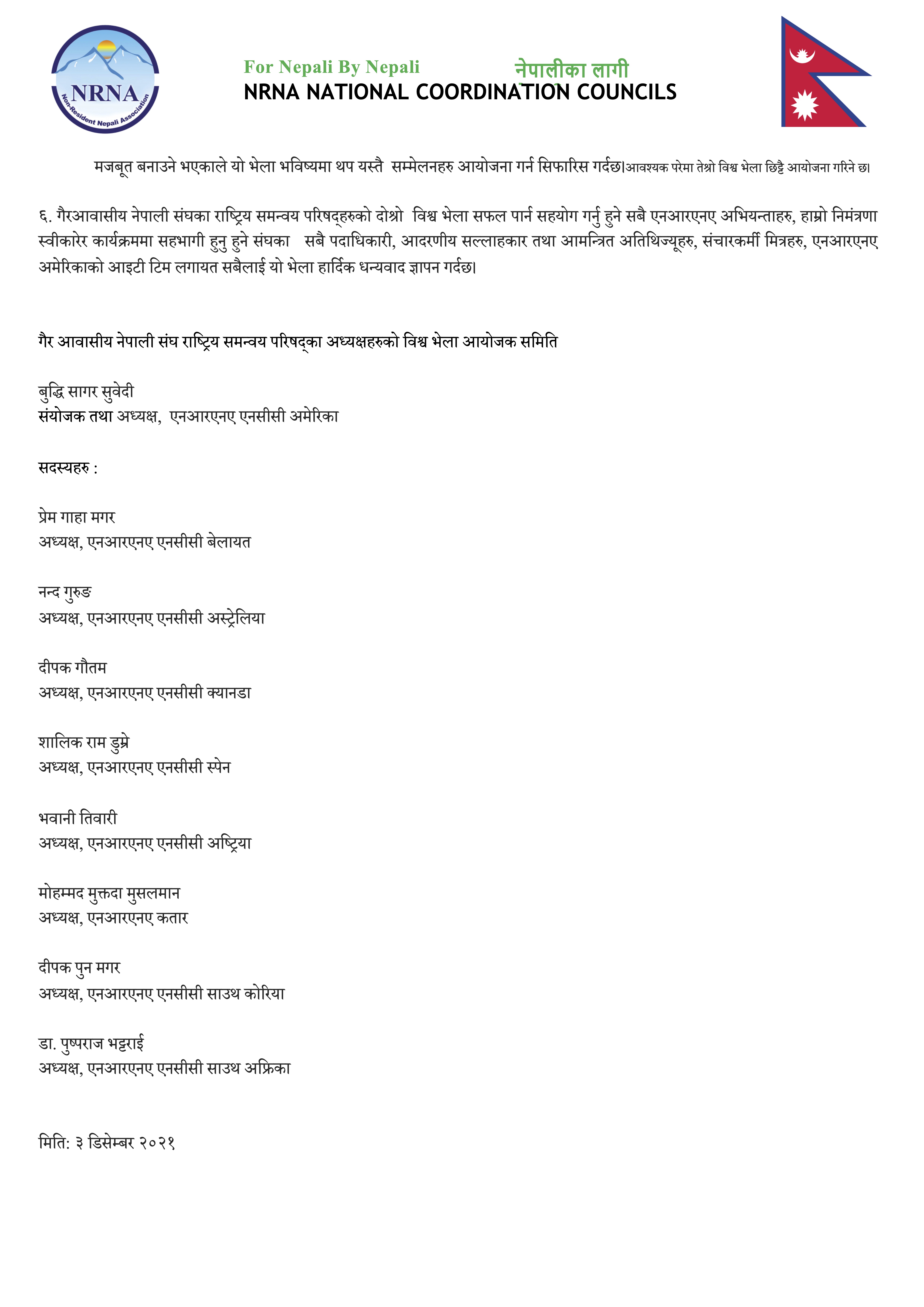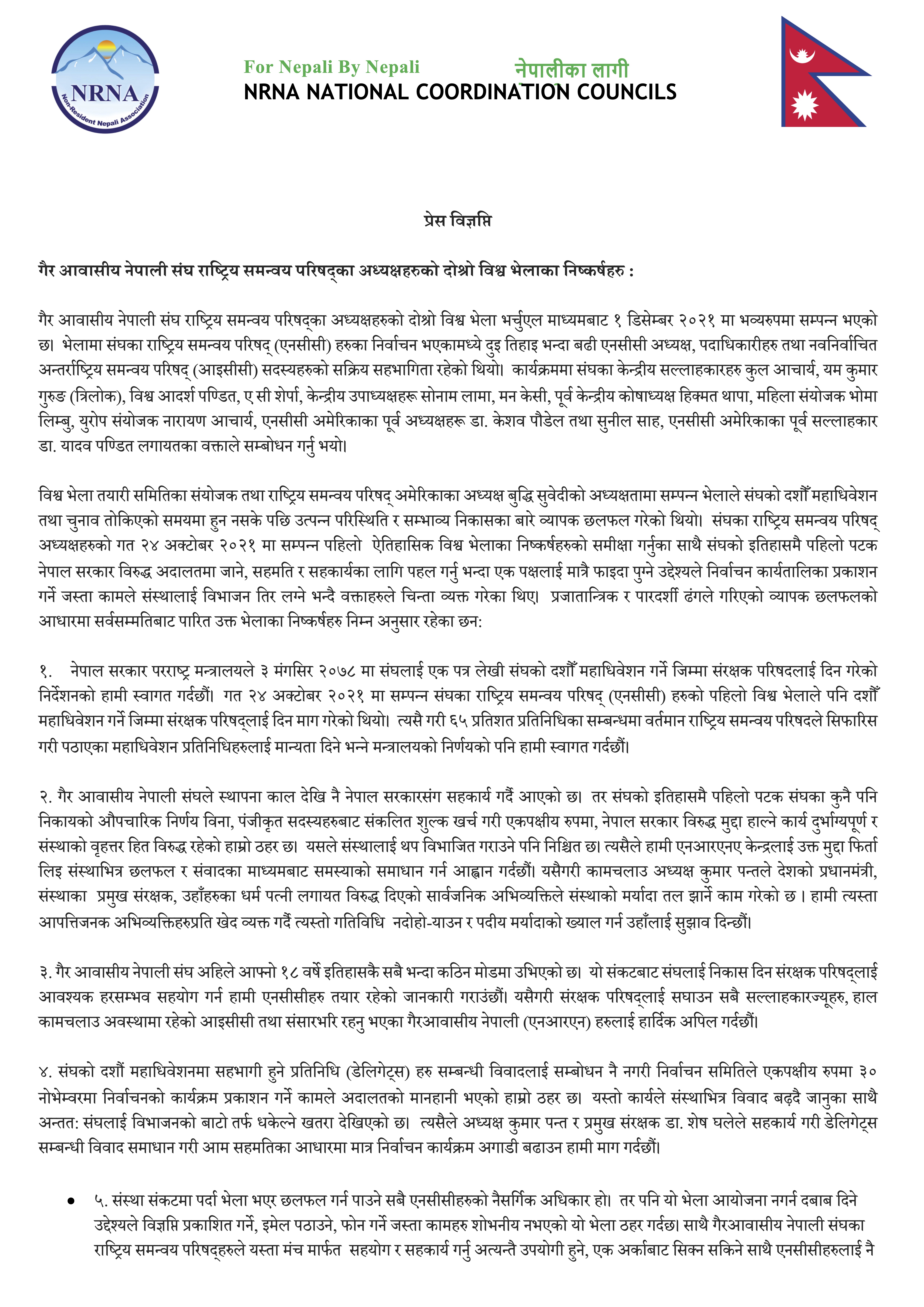 राष्ट्रिय समन्वय परिषद् अमेरिकाका अध्यक्ष तथा विश्व भेला तयारी समिति संयोजक बुद्धि सुवेदीले भने, ‘यसले संस्थालाई थप विभाजित गराउने पनि निश्चित छ । त्यसैले हामी एनआरएनए केन्द्रलाई उक्त मुद्दा फिर्ता लिइ संस्थाभित्र छलफल र संवादका माध्यमबाट समस्याको समाधान गर्न आह्वान गर्दछौं।’