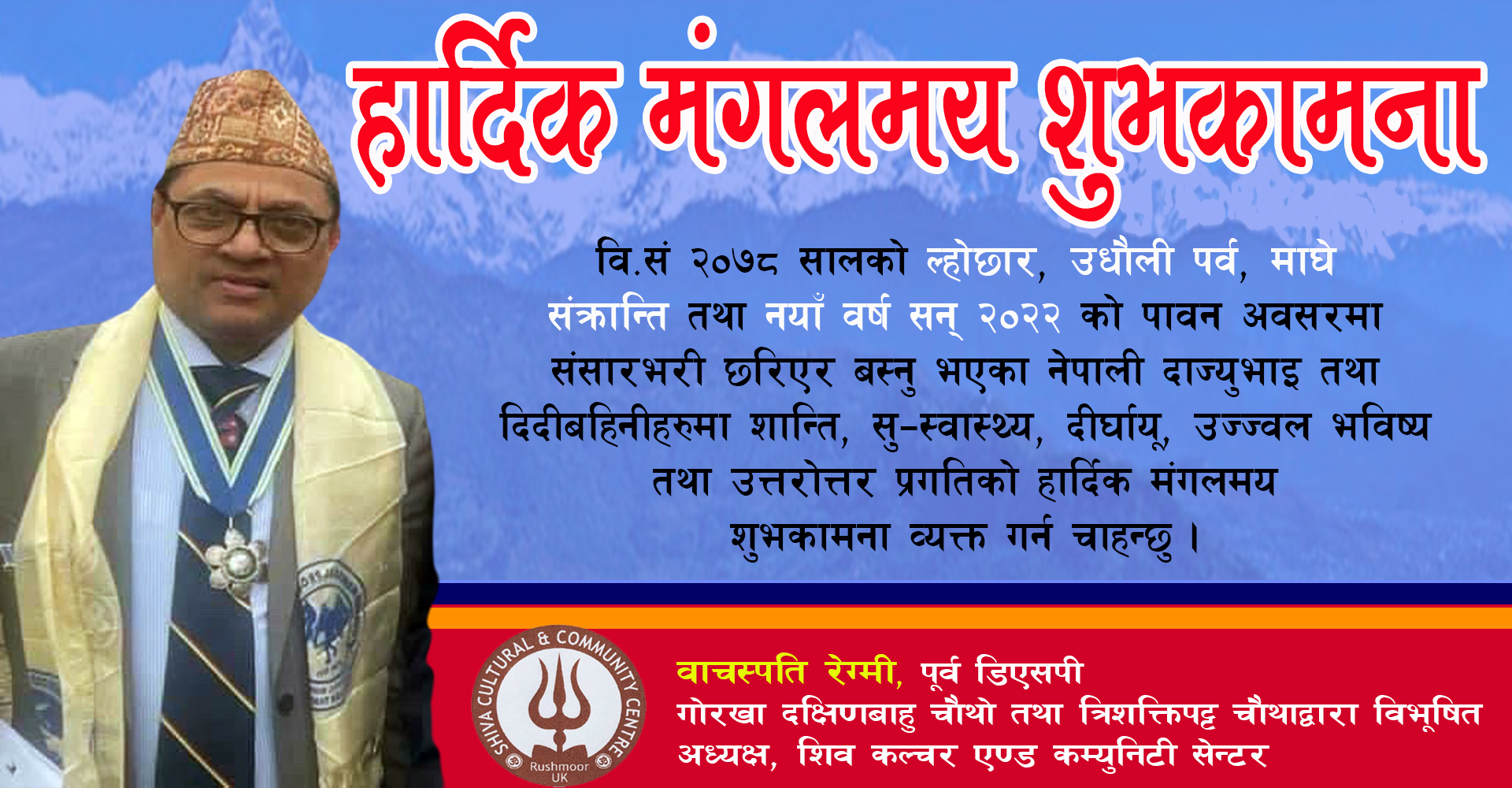 बि सं २०७८ सालको ल्होछार, उघौलि पर्व, माघे संक्रान्ति तथा नयाँबर्ष सन् २०२२ को पावन अबसरमा बिश्वभरी छरिएर बस्नु भएको नेपाली दाज्युभाई तथा दिदीबहिनिहरुमा शान्ति, सु-स्वास्थ्य, दिर्घायू, उज्जवल भविश्य तथा उत्तरोत्तर प्रगतिको हार्दिक मंगलमय शुभकामना व्यक्त गर्न चाहन्छौं।