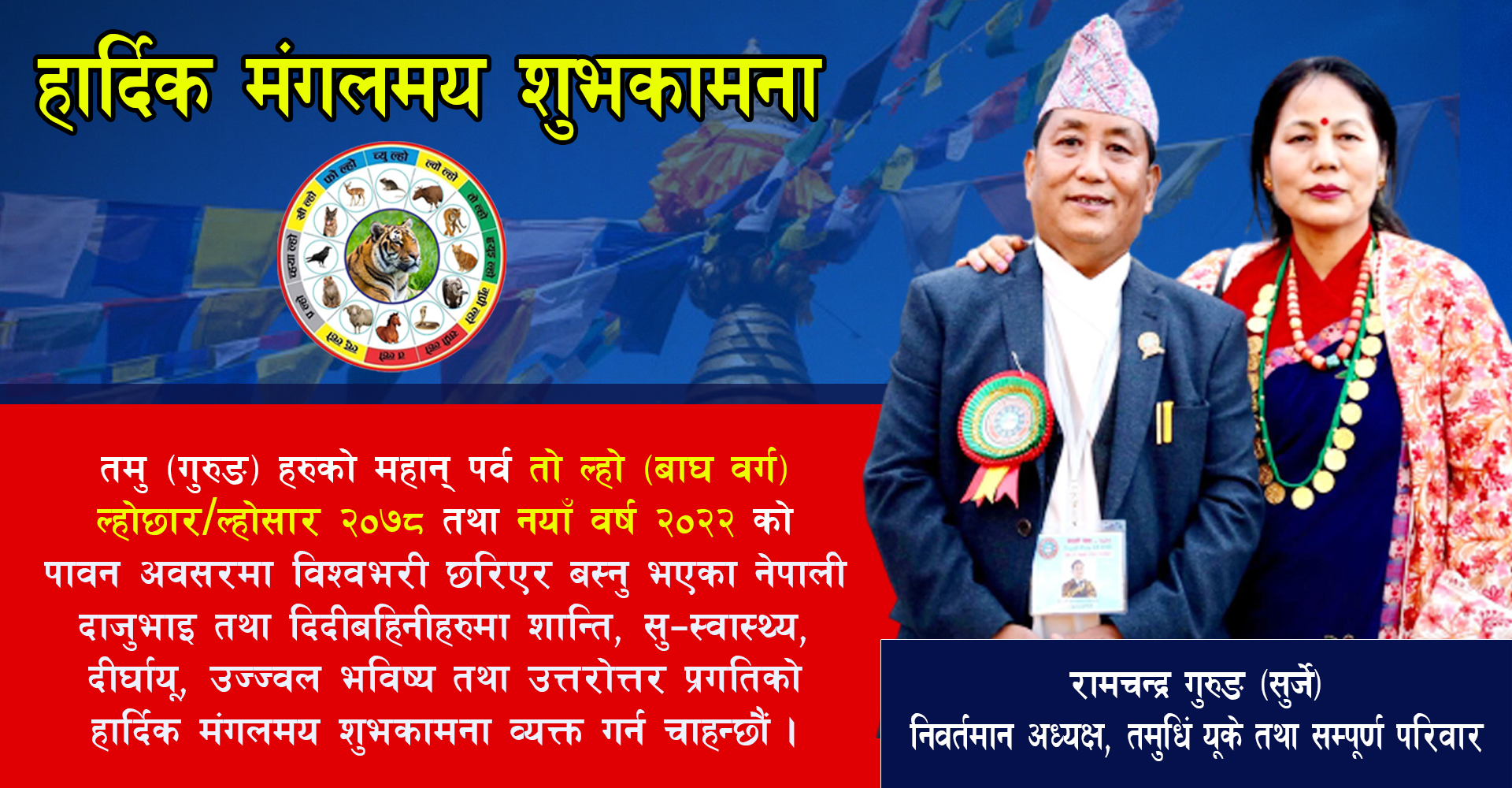 तमु (गुरुङ) हरुको महान् पर्ब तो ल्हो (बाघ बर्ग) ल्होछार/ल्होसार २०७८ तथा नयाँबर्ष सन् २०२२ को पावन अबसरमा बिश्वभरी छरिएर बस्नु भएको नेपाली दाज्युभाई तथा दिदीबहिनिहरुमा शान्ति, सु-स्वास्थ्य, दिर्घायू, उज्जवल भविश्य तथा उत्तरोत्तर प्रगतिको हार्दिक मंगलमय शुभकामना व्यक्त गर्न चाहन्छौं।