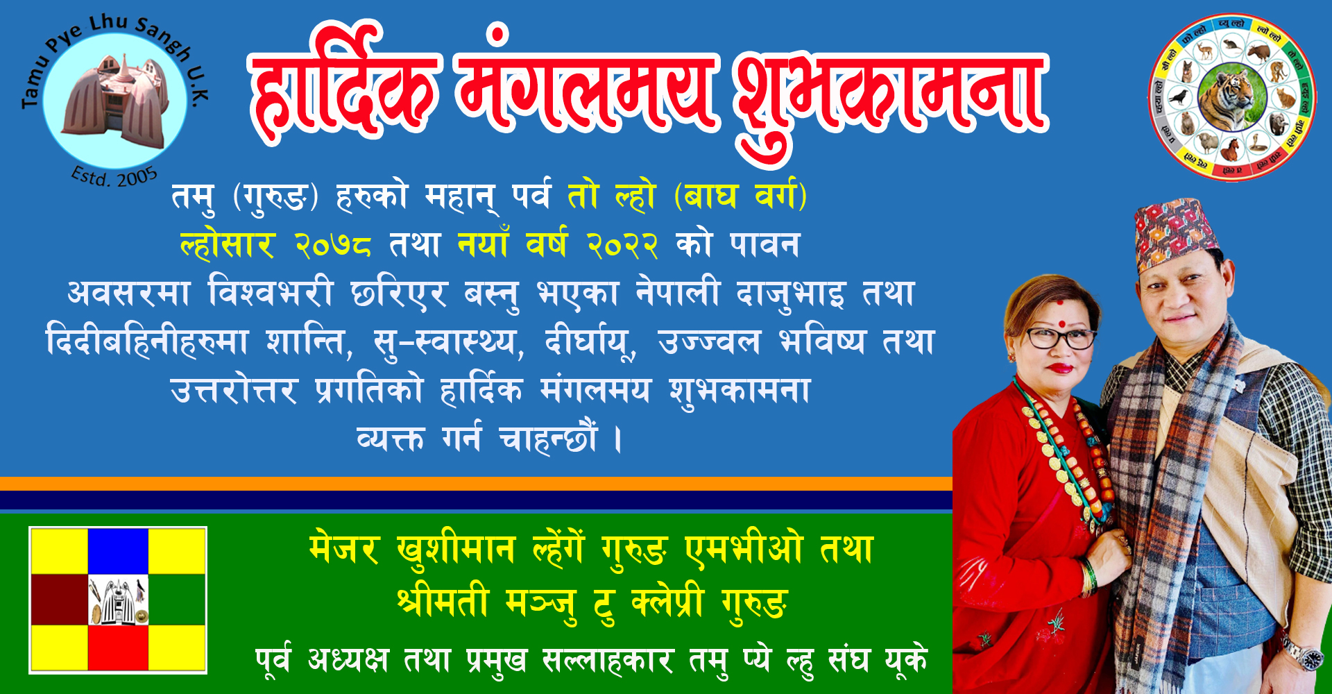 तमु (गुरुङ) हरुको महान् पर्ब तो ल्हो (बाघ बर्ग) ल्होसार २०७८ को पावन अबसरमा बिश्वभरी छरिएर बस्नु भएको नेपाली दाज्युभाई तथा दिदीबहिनिहरुमा शान्ति, सु-स्वास्थ्य, दिर्घायू, उज्जवल भविश्य तथा उत्तरोत्तर प्रगतिको हार्दिक मंगलमय शुभकामना व्यक्त गर्न चाहन्छौं।