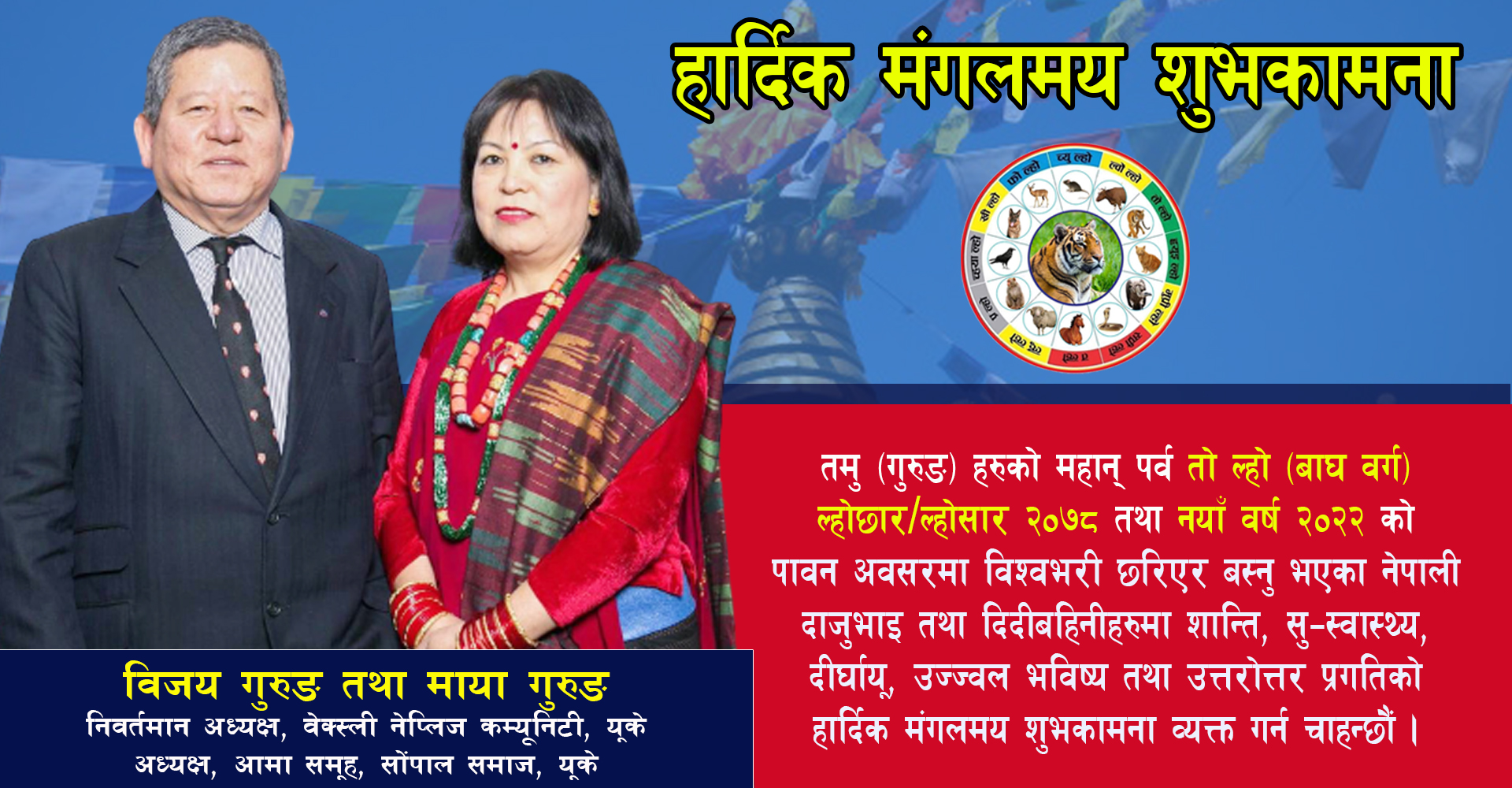 तमु (गुरुङ) हरुको महान् पर्ब तो ल्हो (बाघ बर्ग) ल्होछार/ल्होसार २०७८ तथा नयाँबर्ष सन् २०२२ को पावन अबसरमा बिश्वभरी छरिएर बस्नु भएको नेपाली दाज्युभाई तथा दिदीबहिनिहरुमा शान्ति, सु-स्वास्थ्य, दिर्घायू, उज्जवल भविश्य तथा उत्तरोत्तर प्रगतिको हार्दिक मंगलमय शुभकामना व्यक्त गर्न चाहन्छौं।