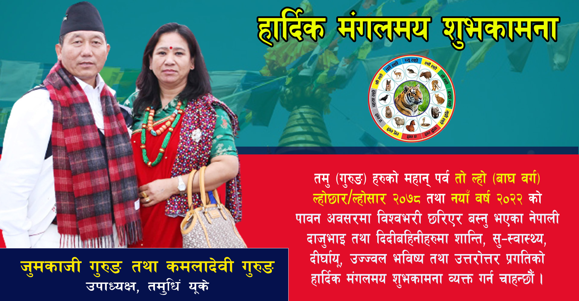 तमु (गुरुङ) हरुको महान् पर्ब तो ल्हो (बाघ बर्ग) ल्होछार/ल्होसार २०७८ तथा नयाँबर्ष सन् २०२२ को पावन अबसरमा बिश्वभरी छरिएर बस्नु भएको नेपाली दाज्युभाई तथा दिदीबहिनिहरुमा शान्ति, सु-स्वास्थ्य, दिर्घायू, उज्जवल भविश्य तथा उत्तरोत्तर प्रगतिको हार्दिक मंगलमय शुभकामना व्यक्त गर्न चाहन्छौं।