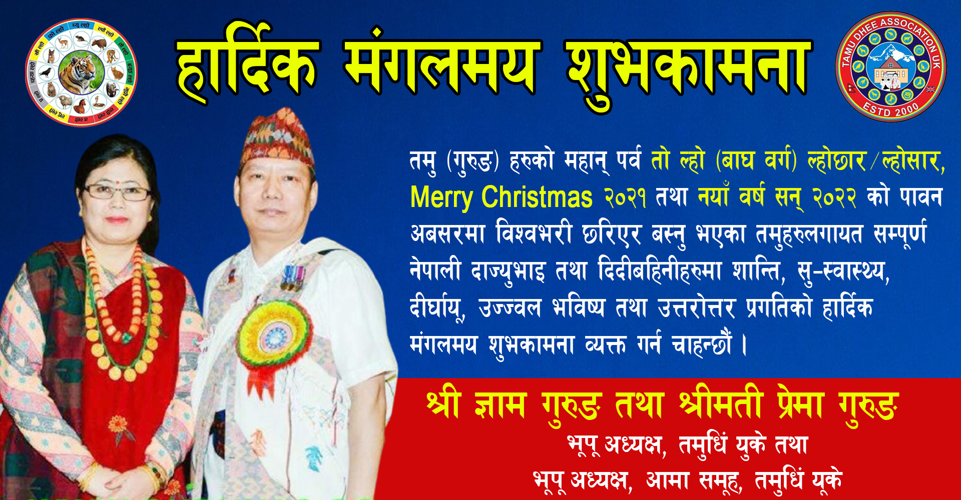 तमु (गुरुङ) हरुको महान् पर्ब तो ल्हो (बाघ बर्ग) ल्होछार/ल्होसार, Merry Christmas २०२१ तथा नयाँबर्ष सन् २०२२ को पावन अबसरमा बिश्वभरी छरिएर बस्नु भएका तमुहरुलागायत सम्पूर्ण नेपाली दाज्युभाई तथा दिदीबहिनिहरुमा शान्ति, सु-स्वास्थ्य, दिर्घायू, उज्जवल भविश्य तथा उत्तरोत्तर प्रगतिको हार्दिक मंगलमय शुभकामना व्यक्त गर्न चाहन्छौं।
