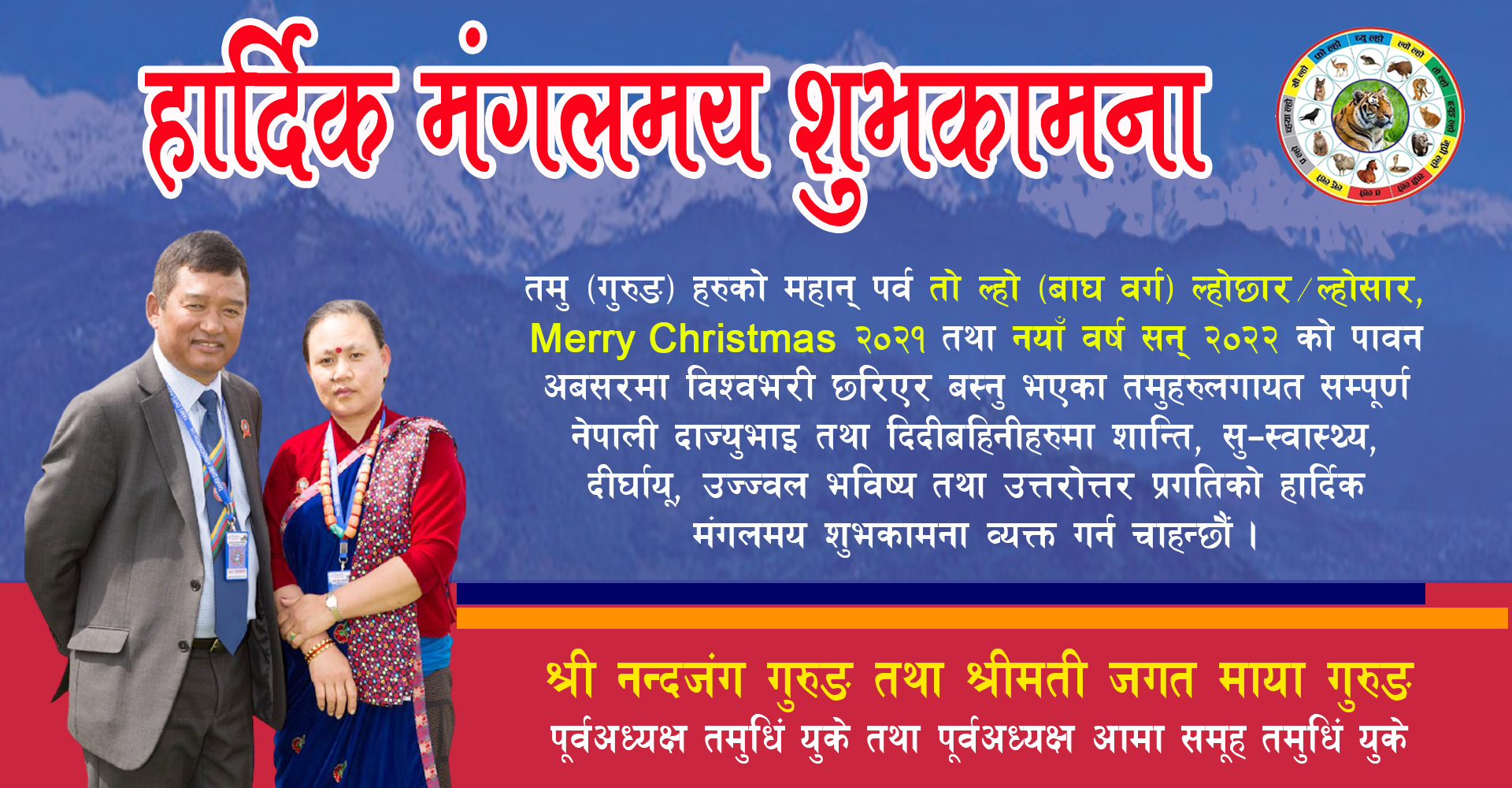 तमु (गुरुङ) हरुको महान् पर्ब तो ल्हो (बाघ बर्ग) ल्होछार/ल्होसार, Merry Christmas २०२१ तथा नयाँबर्ष सन् २०२२ को पावन अबसरमा बिश्वभरी छरिएर बस्नु भएका तमुहरुलागायत सम्पूर्ण नेपाली दाज्युभाई तथा दिदीबहिनिहरुमा शान्ति, सु-स्वास्थ्य, दिर्घायू, उज्जवल भविश्य तथा उत्तरोत्तर प्रगतिको हार्दिक मंगलमय शुभकामना व्यक्त गर्न चाहन्छौं।