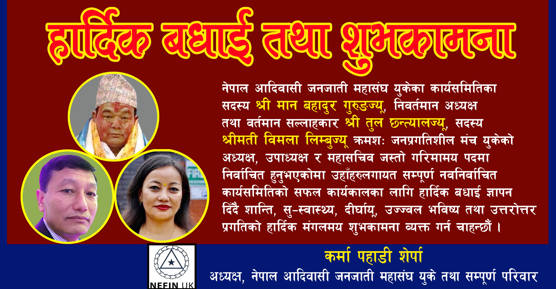 नेपाल आदिवासी जनजाती महासंघ युकेका कार्यसमितिका सदस्य श्री मान बहादुर गुरुङज्यु, निबर्तमान अध्यक्ष तथा बर्तमान सल्लाहकार श्री तुल छन्त्यालज्यु, सदस्य श्रीमती बिमला लिम्बुज्यु क्रमश: जनप्रगतिशील मंच युकेको अध्यक्ष, उपाध्यक्ष र महासचिब जस्तो गरिमामय पदमा निर्वाचित हुनुभएकोमा उहाँहरुलागायत सम्पूर्ण नवनिर्वाचित कार्यसमितिज्यूहरुमा सफल कार्यकालको हार्दिक बधाई ज्ञापन दिदै शान्ति, सु-स्वास्थ्य, दिर्घायू, उज्जवल भविश्य तथा उत्तरोत्तर प्रगतिको हार्दिक मंगलमय शुभकामना व्यक्त गर्न चाहन्छौं।