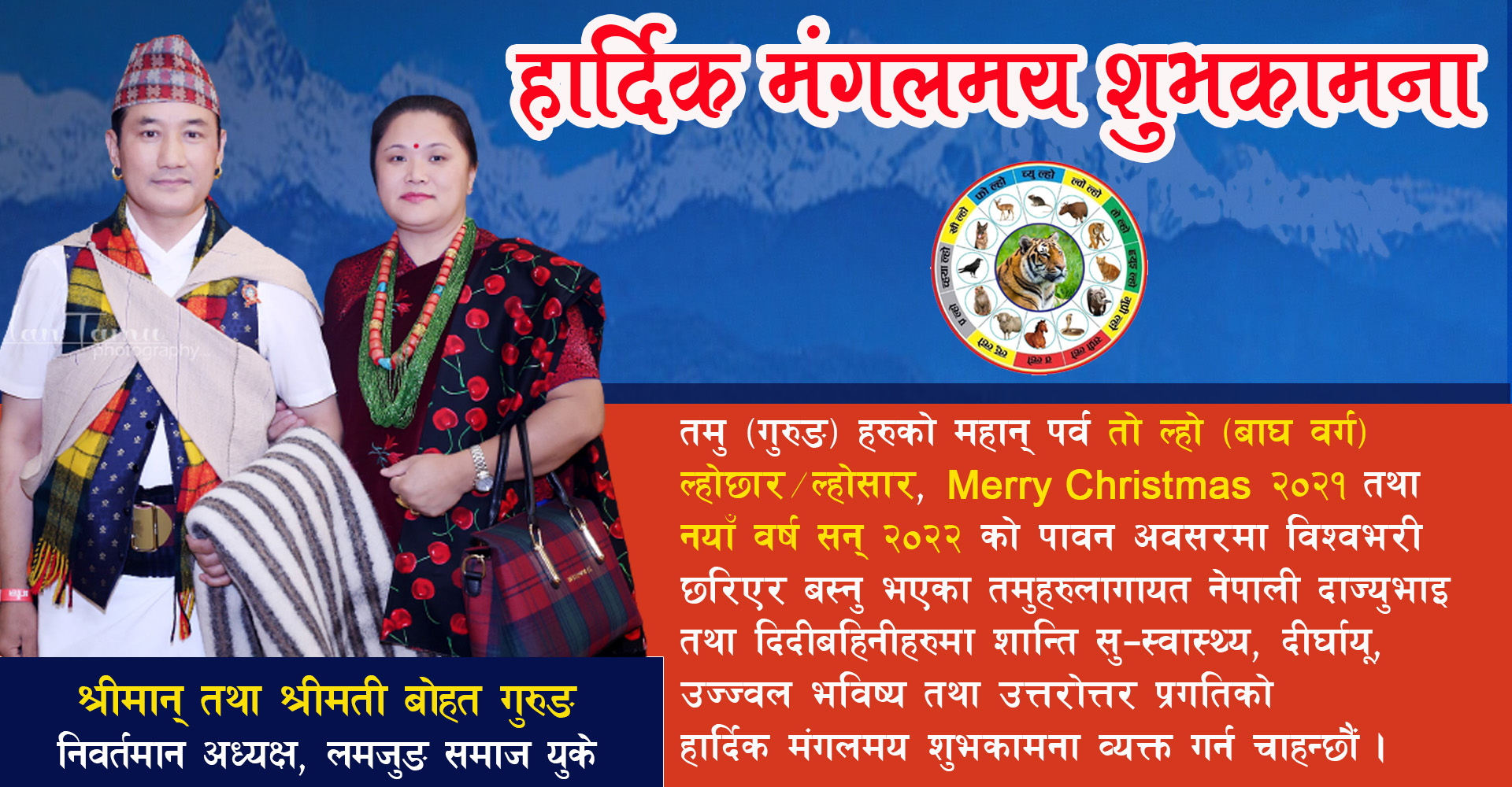 तमु (गुरुङ) हरुको महान् पर्ब तो ल्हो (बाघ बर्ग) ल्होछार/ल्होसार, Merry Christmas २०२१ तथा नयाँबर्ष सन् २०२२ को पावन अबसरमा बिश्वभरी छरिएर बस्नु भएको तमुहरुलागायत नेपाली दाज्युभाई तथा दिदीबहिनिहरुमा शान्ति, सु-स्वास्थ्य, दिर्घायू, उज्जवल भविश्य तथा उत्तरोत्तर प्रगतिको हार्दिक मंगलमय शुभकामना व्यक्त गर्न चाहन्छौं।