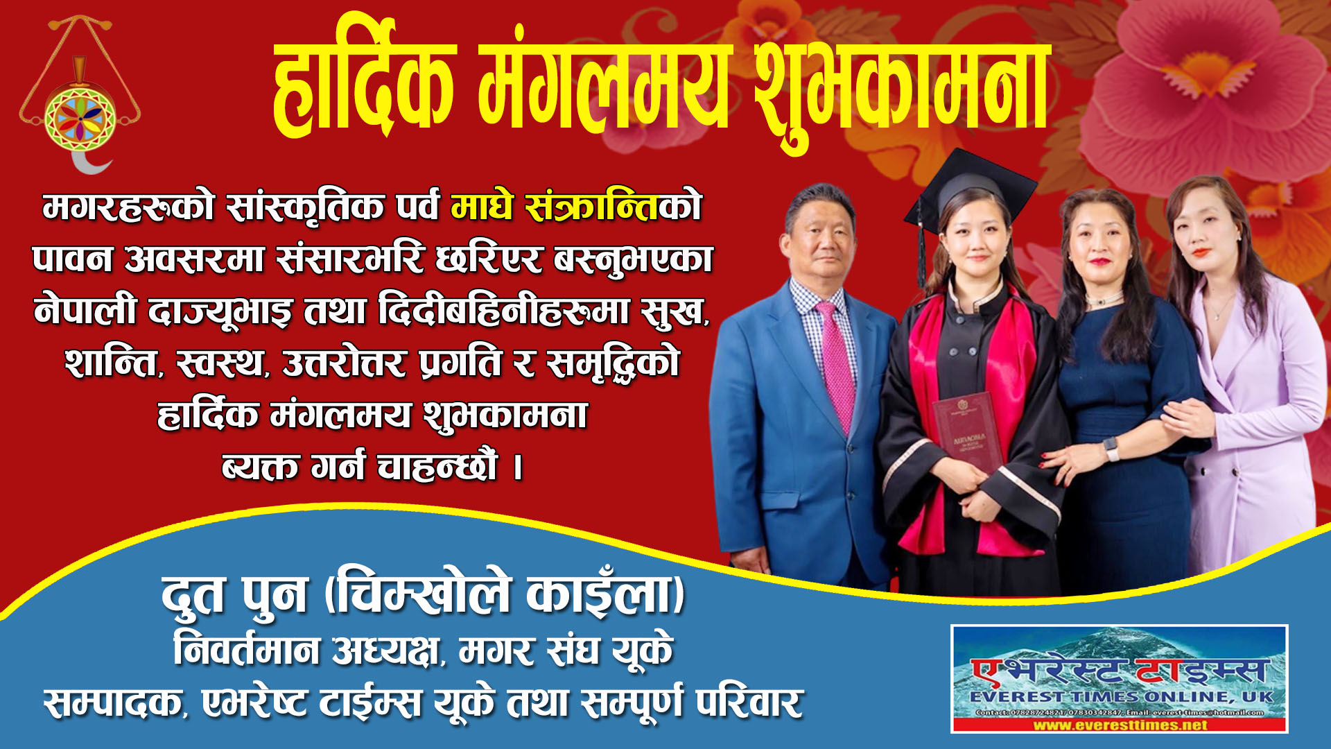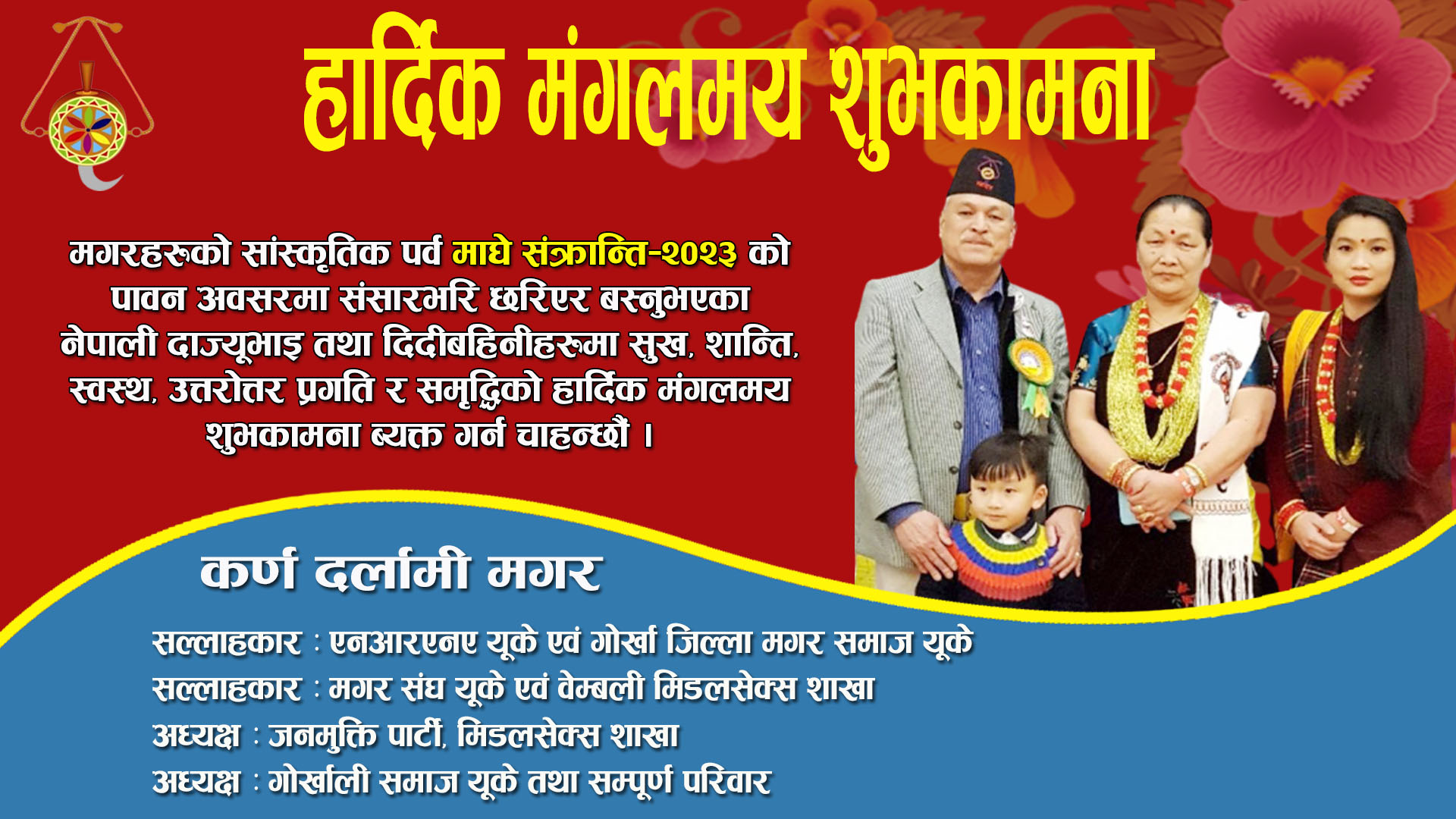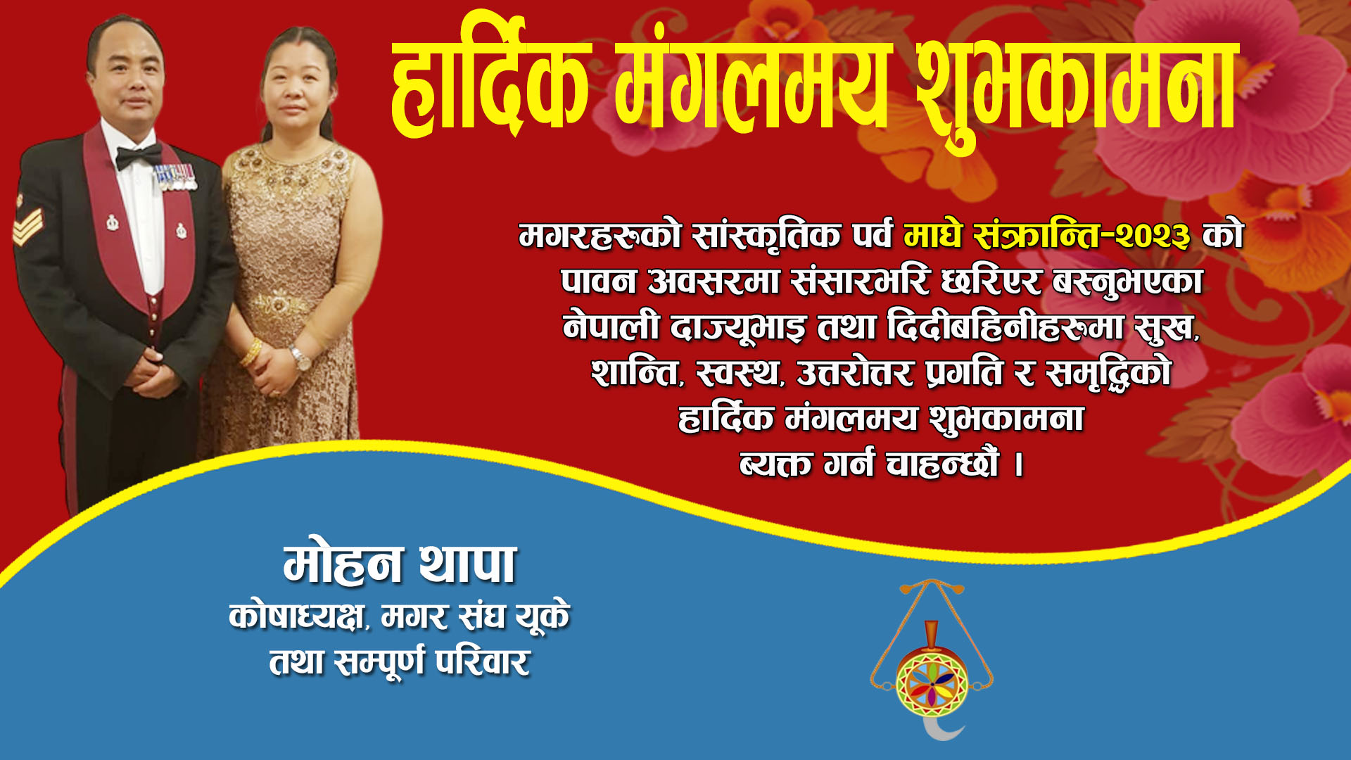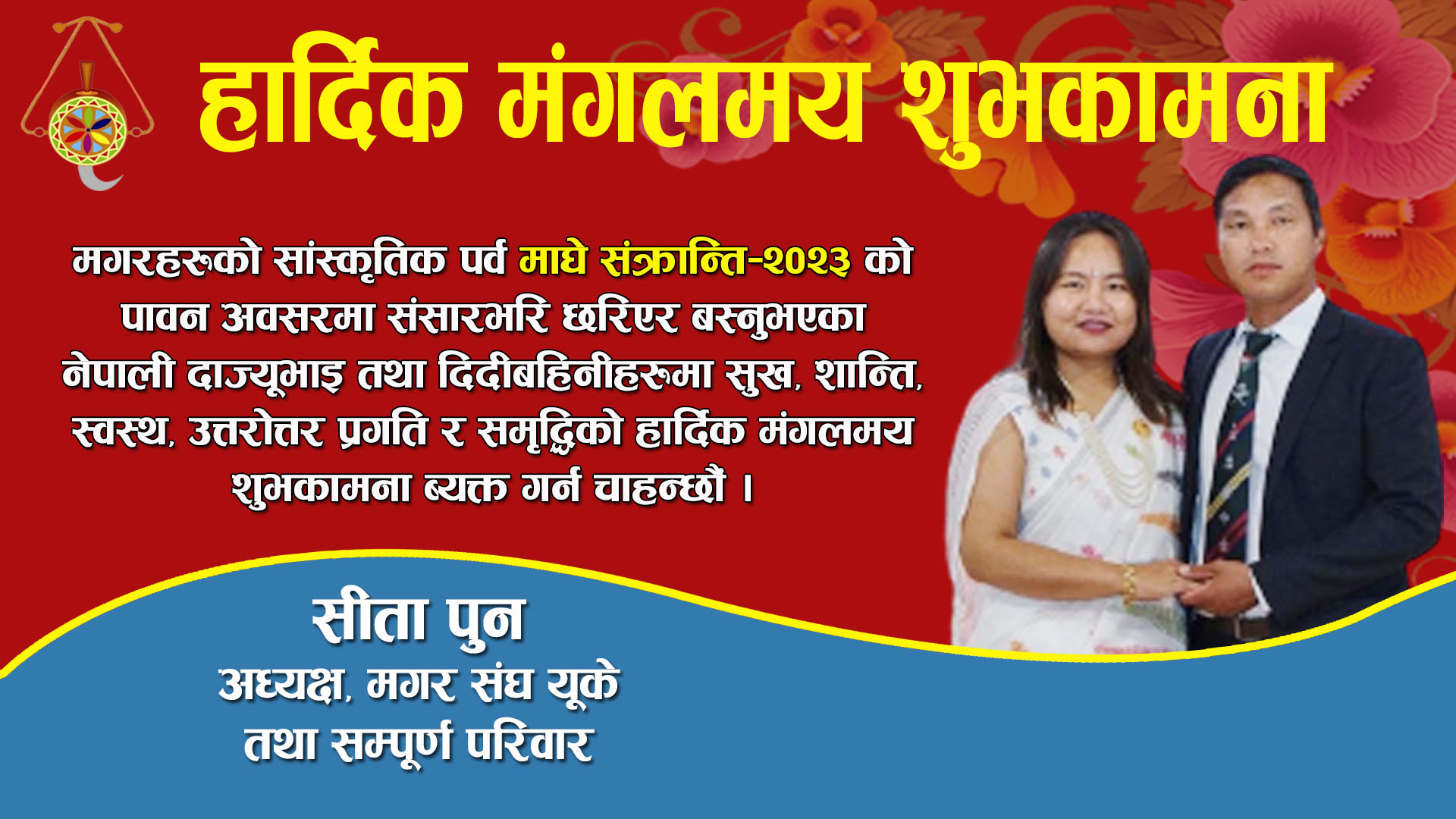 मगरहरुको सांस्कृतिक पर्व तथा नेपालीहरुको माघे संक्रान्तिको पावन अबसरमा संसारभरी छरिएर बस्नुभएको नेपाली दाज्युभाई तथा दिदी बहिनिहरुमा सुख, शान्ति, स्वस्थ, प्रगति र सम्वृद्धिको उत्तरोत्तर हार्दिक मंगलमय शुभकामना ब्यक्त गर्न चाहन्छौं।