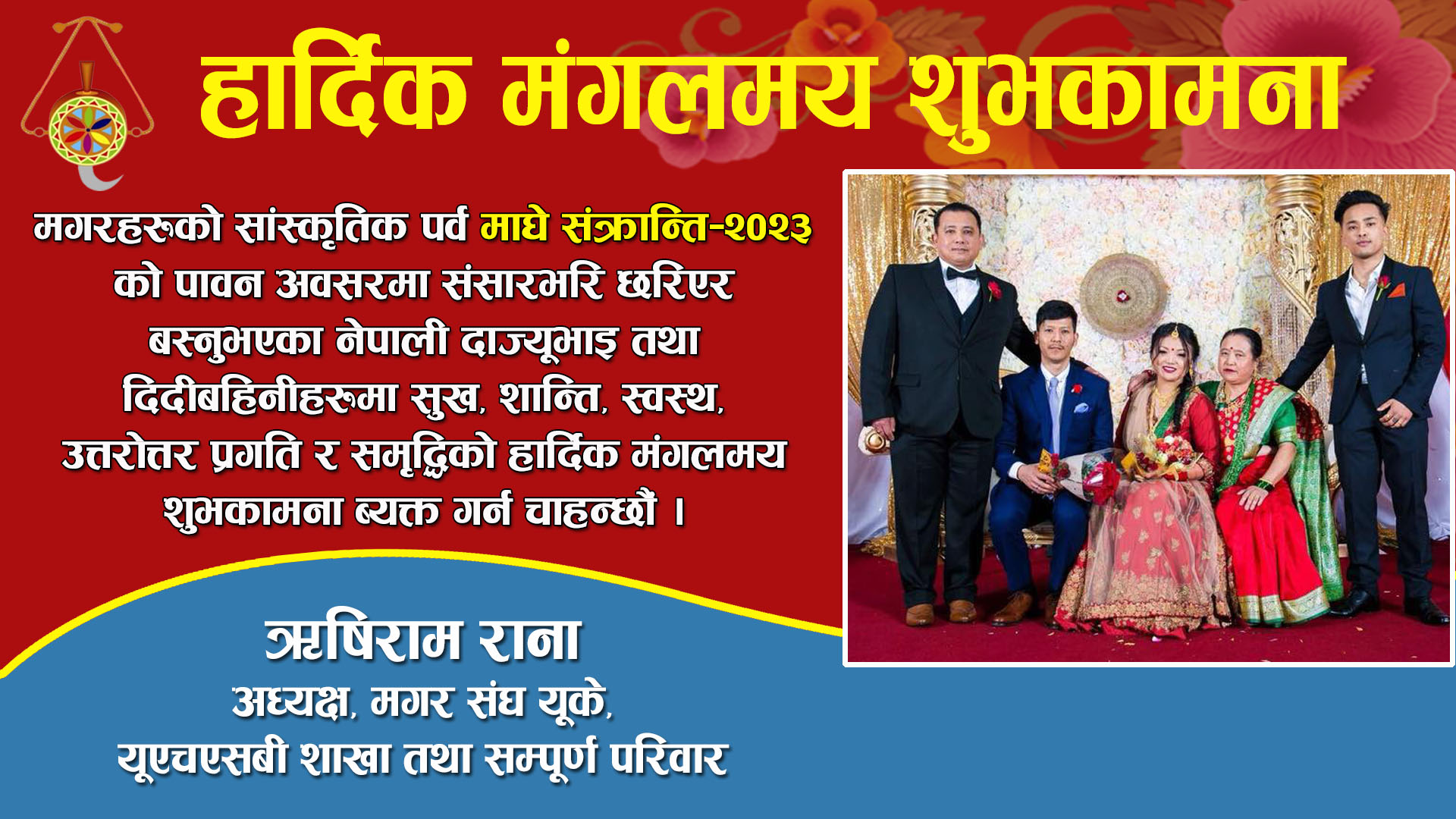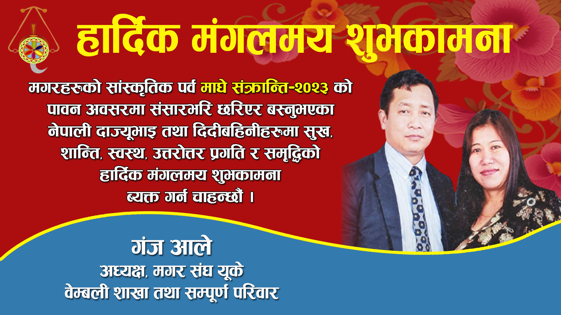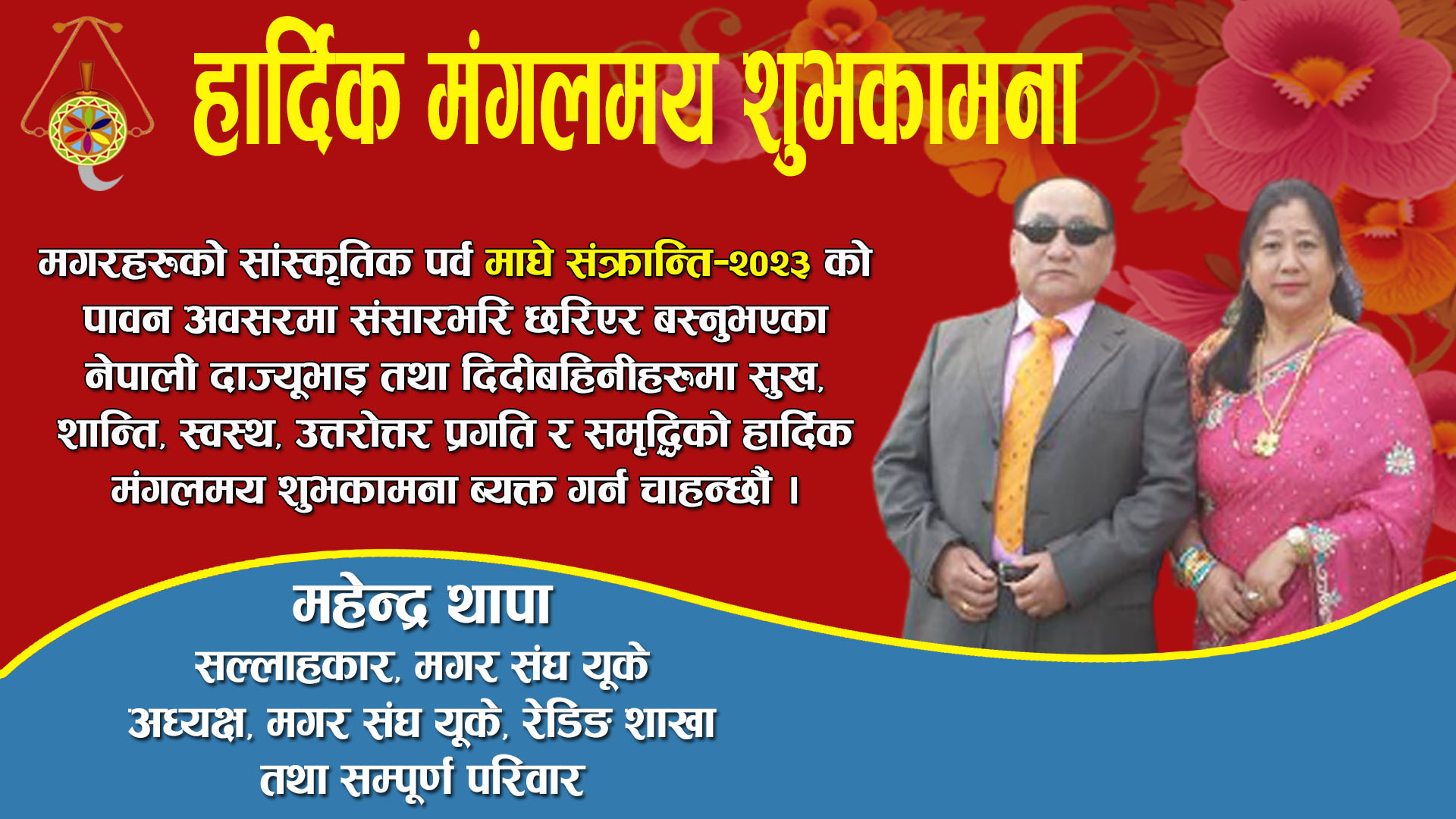 मगरहरुको सांस्कृतिक पर्व तथा नेपालीहरुको माघे संक्रान्तिको पावन अबसरमा संसारभरी छरिएर बस्नुभएको नेपाली दाज्युभाई तथा दिदी बहिनिहरुमा सुख, शान्ति, स्वस्थ, प्रगति र सम्वृद्धिको उत्तरोत्तर हार्दिक मंगलमय शुभकामना ब्यक्त गर्न चाहन्छौं।