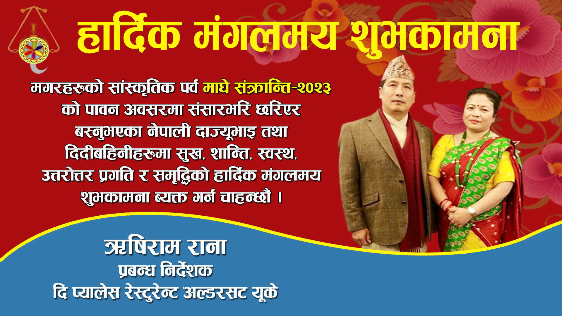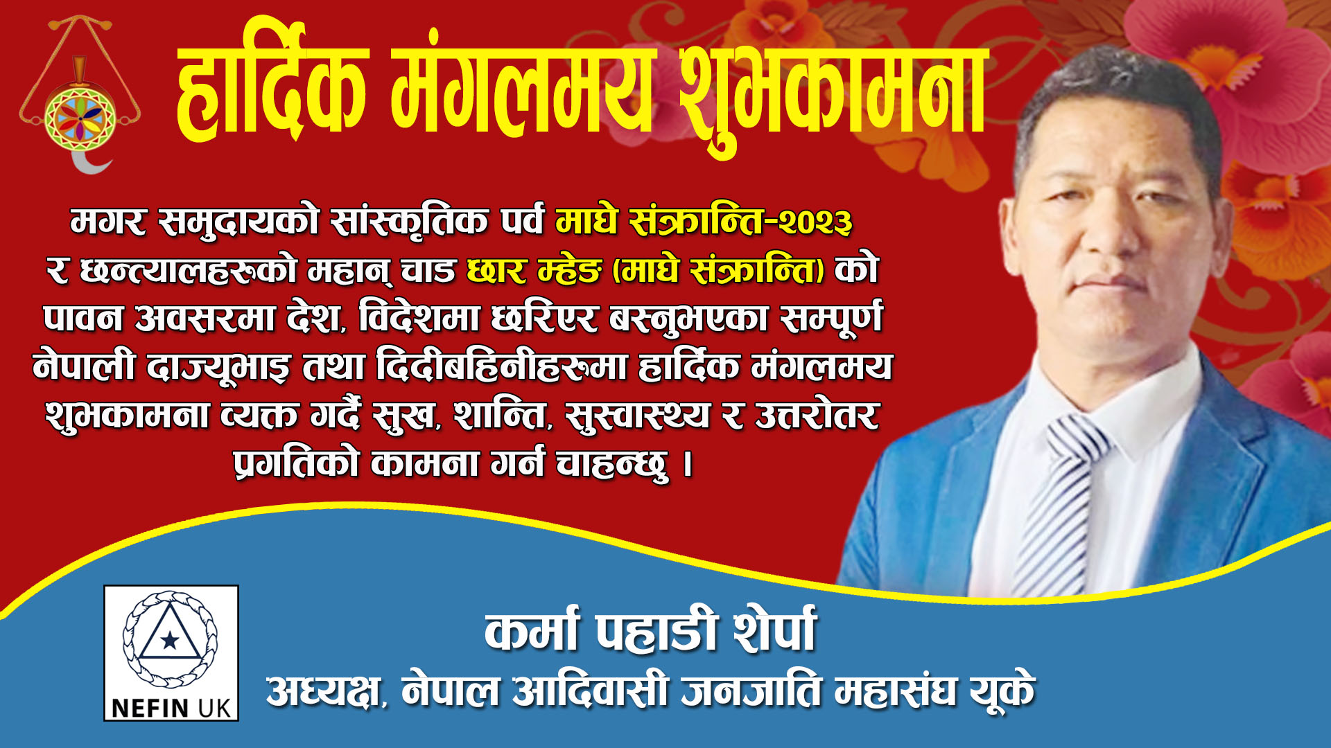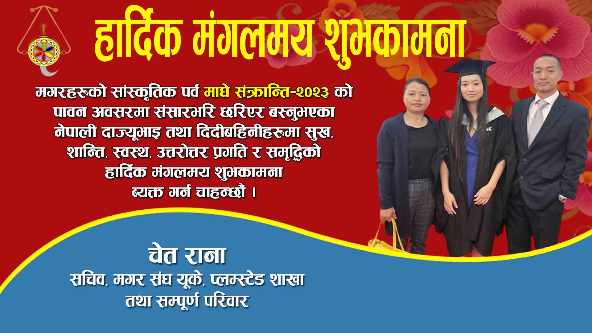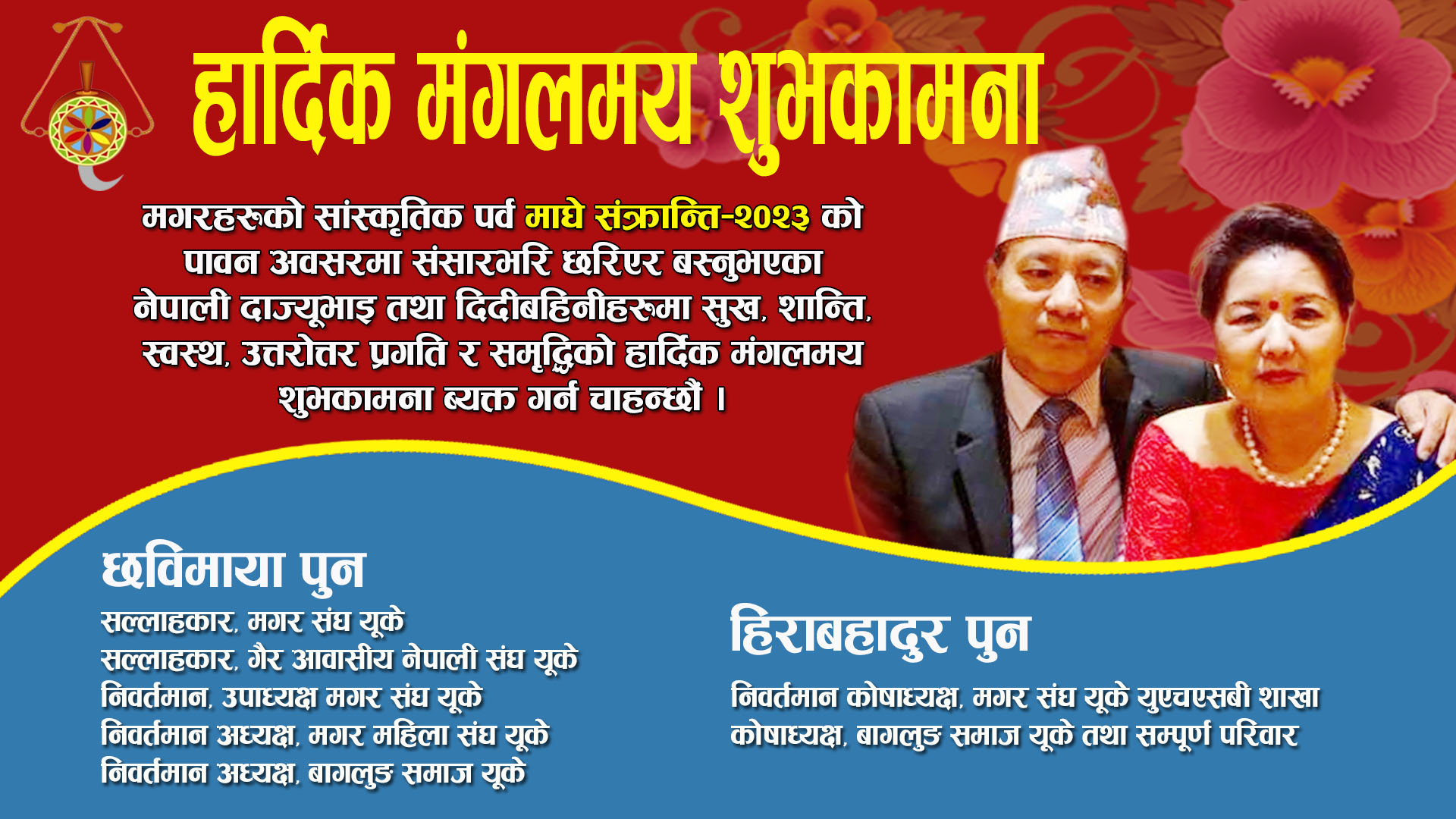 मगरहरुको सांस्कृतिक पर्व तथा नेपालीहरुको माघे संक्रान्तिको पावन अबसरमा संसारभरी छरिएर बस्नुभएको नेपाली दाज्युभाई तथा दिदी बहिनिहरुमा सुख, शान्ति, स्वस्थ, प्रगति र सम्वृद्धिको उत्तरोत्तर हार्दिक मंगलमय शुभकामना ब्यक्त गर्न चाहन्छौं।