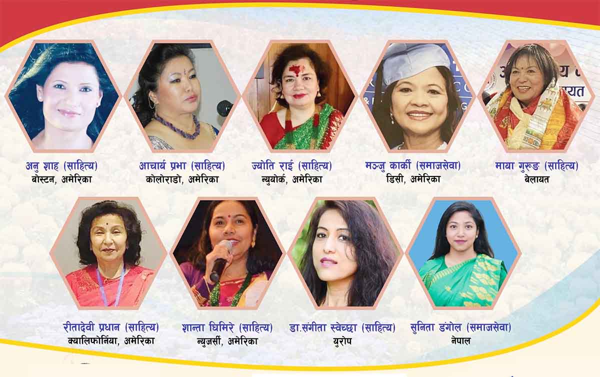 समितिको निर्णयअनुसार माया गुरूङ (साहित्य–बेलायत), अनु शाह (साहित्य-बोस्टन), आचार्य प्रभा (साहित्य-कोलोराडो), ज्योति राई (समाजसेवा-न्यूयोर्क), मञ्जु कार्की संग्रौला (डिसी-समाजसेवा), रीतादेवी प्रधान (क्यालिफोर्निया- साहित्य), शान्ता घिमिरे (न्यूजर्सी- साहित्य), डा. संगीता स्वेच्छा (साहित्य-युरोप) र सुनिता डंगोल (उपमेयर–काठमाडौं, समाजसेवा) रहेका छन् ।