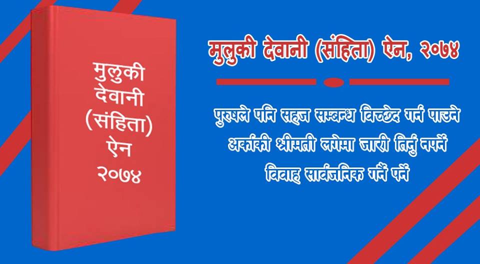 नेपालीले स्वतन्त्रताको उपभोग गर्न पाएको धेरै भइसक्यो । हरेक किसिमका स्वतन्त्रताको उपयोग गर्दै आउ“दा कतिपय सवालमा भने बढी भड्किलो र समाजमै नकारात्मक पर्ने काम पनि भएका छन् । नागरिकले स्वतन्त्र रुपमा आफ्ना अधिकार उपभोग गर्न पाउने अधिकार त छ“दैछ, स्वतन्त्रताको नाममा देखिएको अराजकता, अन्यौलता र अनुशासनहिनताले पनि सीमा नाघेकै छ । यो सवालमा नागरिकलाई नै थप जिम्मेवार बनाउनका लागि राज्यले विभिन्न समयमा नियम कानुन बनाउने गर्छन् नै । तर नियम कानुनले पनि सीमा मिचेर संवैधानिक व्यवस्थाकै धज्जी उडाउन थाल्यो भने चाहि“ सचेत र खबरदारी गर्नैपर्ने हुन्छ । भदौ १ बाट नेपालले पुरानै कानुनको नया“ रुप पायो । जंगबहादुर राणाले १९१० सालमा बनाएको मुलुकी ऐनकै निरन्तरतास्वरुप आएको मुलुकी ऐन, २०२० खारेज गरी मुलुकी संहिता ऐन २०७४’ कार्यान्वयनमा ल्याएको छ । भदौ १ देखि कार्यान्वयनमा आएको ऐनमा मुलुकी अपराध (संहिता) ऐन २०७४, मुलुकी फौजदारी कार्यविधि (संहिता) ऐन २०७४, फौजदारी कसुर (सजाय निर्धारण तथा कार्यान्वयन) ऐन २०७४, मुलुकी देवानी (संहिता) ऐन २०७४ र मुलुकी देवानी कार्यविधि (संहिता) ऐन २०७४ हुन् । यो ऐन एक वर्षअघि नै लालमोहर लगाएर अहिले आएको हो ।