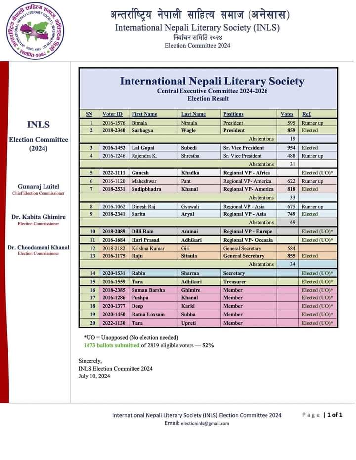 यसैगरि वरिष्ठ उपाध्यक्षमा लाल गोपाल सुवेदी, क्षेत्रीय उपाध्यक्ष अमेरिकाका लागि सुदिपभद्र खनाल, एसियाको लागि सरिता अर्याल तथा महासचिवमा राजु सिटौला विजयी भएका छन् ।