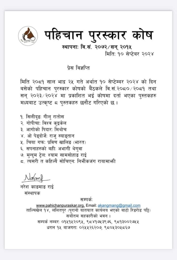 लन्डन १० सेप्टेम्बर २०२४ । पहिचान पुरस्कार कोषले २०८० को लागि उत्कृष्ट ८ वटा पुस्तकहरु छनोट गरेको छ । जसमा उत्कृष्ट छनोट गरिएका पुस्तकहरु सिलीदुङः गीलु रातोस, गोपीचाः विश्व कुइँकेल, आगोको पिदारः मिथोच, ओ पेङ्दोर्जेः राजु स्याङ्तान, चिया गफः प्रविण खालिङ (भारत), सपनाहरुको बहीः अभागी थेगुवा, मुन्दुम ट्रेलः श्याम सामसोहाङ राई, त्यसरी त कहिल्यै सोचिएनः निर्भीकजंग रायामाझी रहेको छ ।