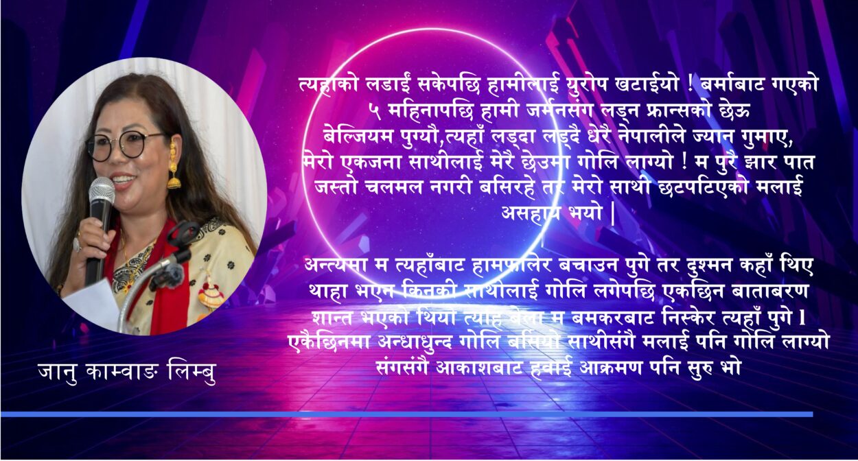 त्यहाको लडाईं सकेपछि हामीलाई युरोप खटाईयो ! बर्माबाट गएको ५ महिनापछि हामी जर्मनसंग लड्न फ्रान्सको छेऊ बेल्जियम पुग्यौ ,त्यहाँ लड्दा लड्दै धेरै नेपालीले ज्यान गुमाए, मेरो एकजना साथीलाई मेरै छेउमा गोलि लाग्यो ! म पुरै झार पात जस्तो चलमल नगरी बसिरहे तर मेरो साथी छटपटिएको मलाई असहाय भयो | अन्त्यमा म त्यहाँ बाट हामफालेर बचाउन पुगे तर दुश्मन कहाँ थिए थाहा भएन किनकी साथीलाई गोलि लगेपछि एकछिन बाताबरण शान्त भएको थियो त्यहि बेला म बमकरबाट निस्केर त्यहाँ पुगे l एकैछिनमा अन्धाधुन्द गोलि बर्सियो साथीसंगै मलाई पनि गोलि लाग्यो संगसंगै आकाशबाट हवाई आक्रमण पनि सुरु भो ..मैले साथीलाई तानेर बमकर सम्म ल्याए मेरो देब्रे फिलामा गोलि लागेको थियो। साथीको मायाले आफ्नो पीडाको ख्यालै भएन उसले आफ्नो आमाको नाम लिंदा मेरो मुटु चिरा चिरा भयो, म संगै छुट्टिएको मेरो परिवारको याद आयो धरधरी रुएँ, मेरो तातो आँशुले आँखा बन्द भयो बमकर भित्र भित्ता भित्तामा मुर्की बजार्दै रुएँ ……आमाको नाम लिंदा लिदै मेरै काखमा साथीको प्राण गयो l कथा भन्दा भन्दै बाजे निकै भाबुक हुनुभो अँध्यारोमा आँखा रसायो सायद टोपीले आँखा पुछेर फेरि भन्नु भो जा..जा.. माया अघेना बाट आगो ले …म दौडिएर अगेनामा पुगेर झ्वाट्टै आगो लिएर आएँ, आउदा मकै केलाउदै बसेको बोजुको खुट्टामा ठोक्किएर झन्डै लडेको देखेर बोजुले भन्नु भो,,,, हेर हेर यसलाई कथा सुन्न हतार भको ? बिस्तारै हिड ? तुफान दौडिएर बाजेलाई अघुल्टो दिंदै, अनि के भो बाजे ? भन्दै उत्सुकता जनाएँ भाई बाजेको काखमा निदाई सकेको रहेछ बोलेन l कानमा च्यापेर राखेको खस्टाले बेरेको सुर्ती सल्काउदै फेरि भन्न थाल्नु भो … त्यो रात त्यहि रात काटियो,मैले बोकेको टुमलेतको पानी, खाना सबै सकिएको थियो, साथिको प्राण भईन्जेल मैले याद नगरेको मेरो फिलाको चोट बल्ल दुख्न थाल्यो, म बेस्सरी छटपटटिन थालें l रात भरि छोरीहरु र स्वास्नीलाई सम्झे, छोरोलाई सम्झे राम्ररी त्रेनिंग पनि नसकी लडाईमा होमिनु पर्यो कता कुन ठाउमा बिजोक भको होला सम्झे आशुको बलिन्द्र भेल बग्न थाल्यो, बेसरी चिच्याउदै सारा सिमे भूमे, ईस्ट मित्र, घर परिवार, गाऊ घर, साथि संगीहरु सम्झे ! बाँचेर आउछु भन्ने एक झिनो आशा थिएन,