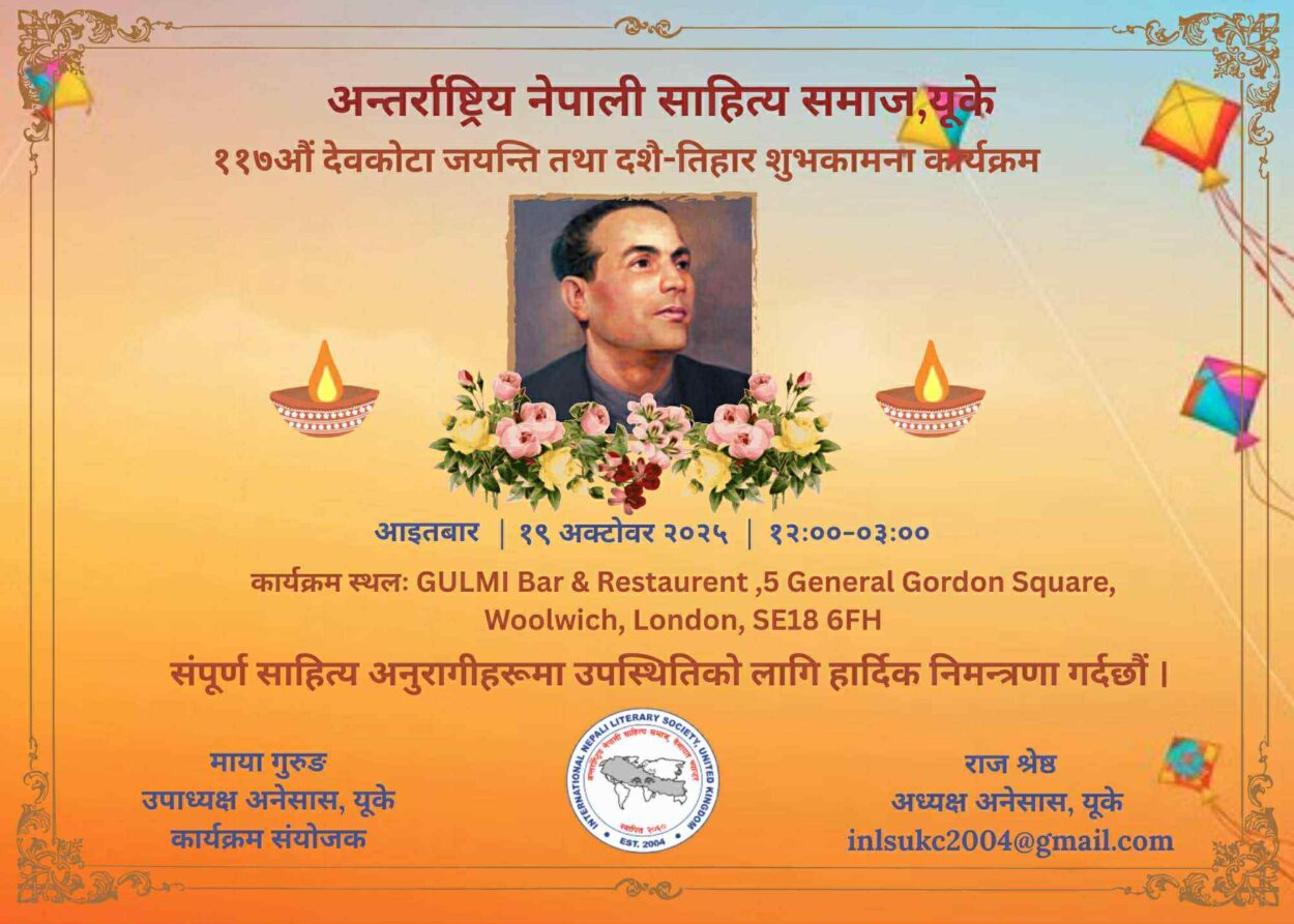बेलायत ५ अक्टुबर २०२५ । अन्तर्राष्ट्रिय नेपाली साहित्य समाज बेलायत (अनेसास) च्याप्टरले ११७ औं लक्ष्मीप्रसाद देबकोटा जयन्ती तथा दसैं तिहार शुभकामना कार्यक्रम आयोजना गर्ने भएको छ ।