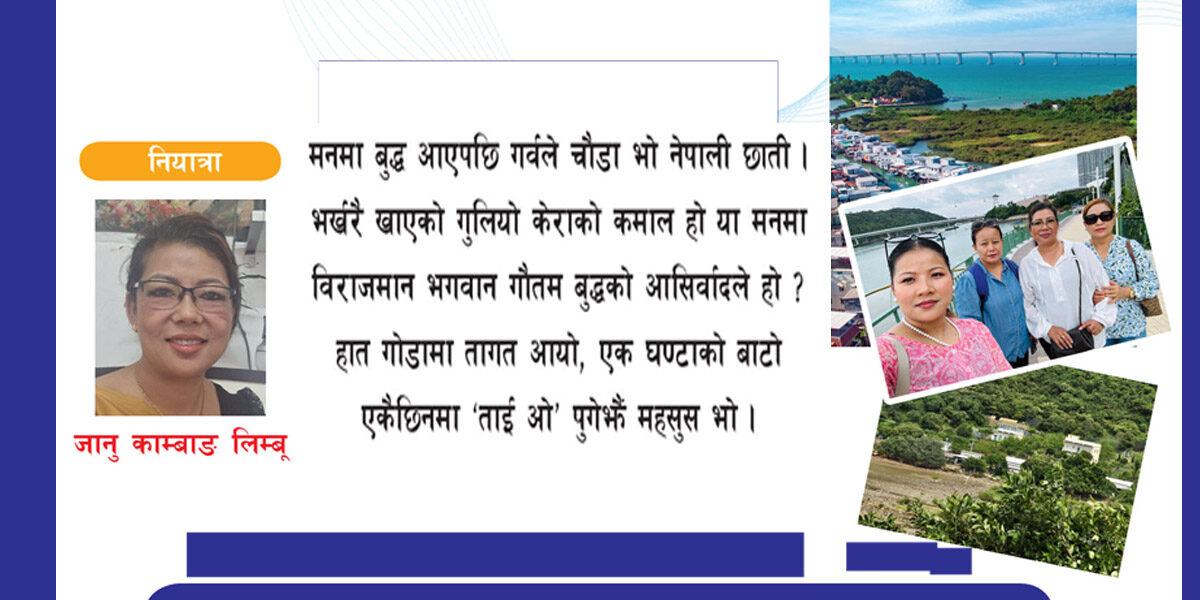 उता हेर्दा समुद्र, समुद्र माथि मकाऊ जाने पुल, यता हेर्यो ‘ताई ओ’ बजार । गहिरी गाउँ समाधिस्थल । ट्याक्कै ग्रेट वालजस्तो, बाटोको टुप्पामा एउटा प्यागोडा शैलीको बिसौनी घर । त्यहाँ अघिदेखि धेरै मान्छे फोटो र टिकटक खिचिरहेका । सारै आनन्द लाग्ने डाँडा । त्यहाँबाट हङकङका विभिन्न स्थानहरू नियाल्न सकिने । हामीले पनि केहीथान फोटो परदेशी मैया (फिलिपिन्सहरू) लाई खिच्न लगायौं । अनि ओरालो लाग्यौं । म र गीता दिदीको पहाडे ज्यानमा भन्दा तराईतिर हुर्केका बुहारीहरूको ज्यानमा थकानको मात्रा ज्यादा देखियो त्यसदिन ।