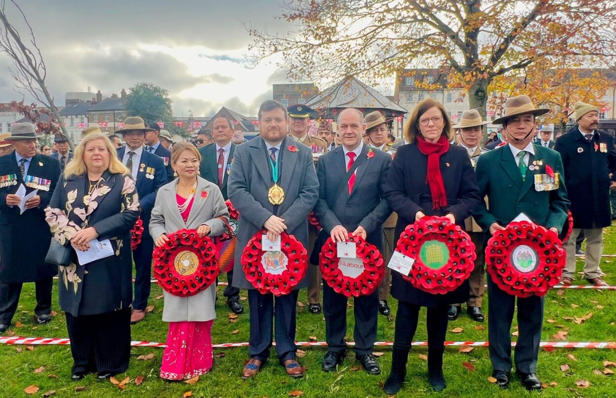 The formal Wreath-Laying Ceremony saw local and military leadership stand shoulder-to-shoulder with community leaders. Wreaths were laid in the first row by Mayor of Rushmoor Councillor Calum Stewart, Alex Baker MP for Aldershot Constituency, GRNC President Mrs. Lila S. Mabo, and Trustee Mr. Ramdhan Rai.