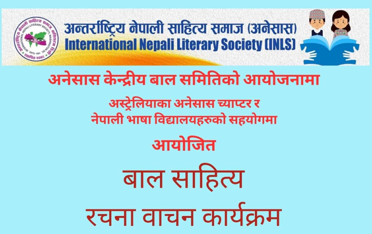 शनिबार बिहान ९ बजे जुममार्फत बाल साहित्य रचना वाचन कार्यक्रम हुन लागेको हो । कार्यक्रमका लागि संयोजन सहयोग नेपाली भाषा विद्यालय शब्दमाला, पाठशाला अस्ट्रेलिया, सम्झना पाठशाला नेपाली, नानीबाबु नेपाली पाठशालालगायत छन् ।