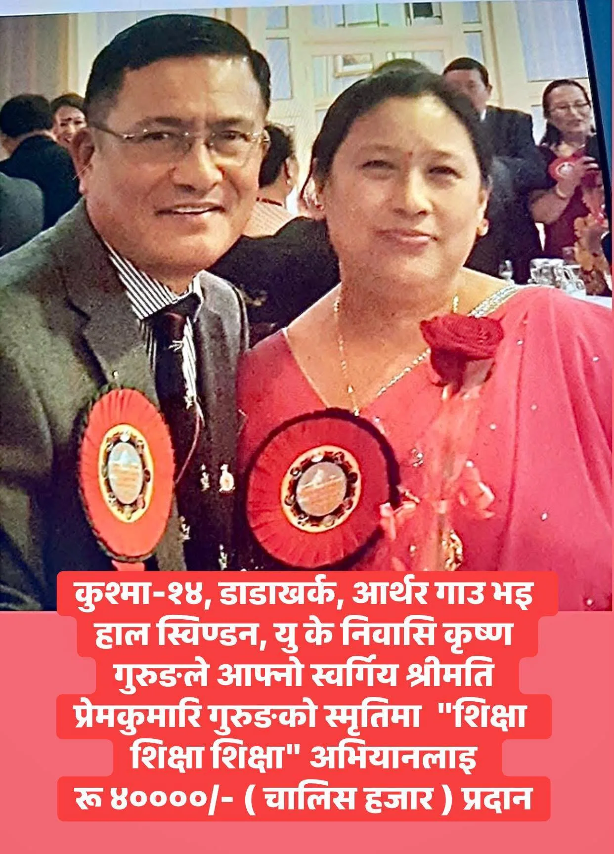 यसैगरी कुश्मा-१४, डाँडाखर्क, आर्थर गाउँ भइ हाल स्विण्डन, यूके निवासी कृष्ण गुरुङले आफ्नो स्वर्गीय श्रीमती प्रेमकुमारि गुरुङको स्मृतिमा “शिक्षा शिक्षा शिक्षा” अभियानलाई ४० हजार रुपैयाँ प्रदान गरेका छन् ।