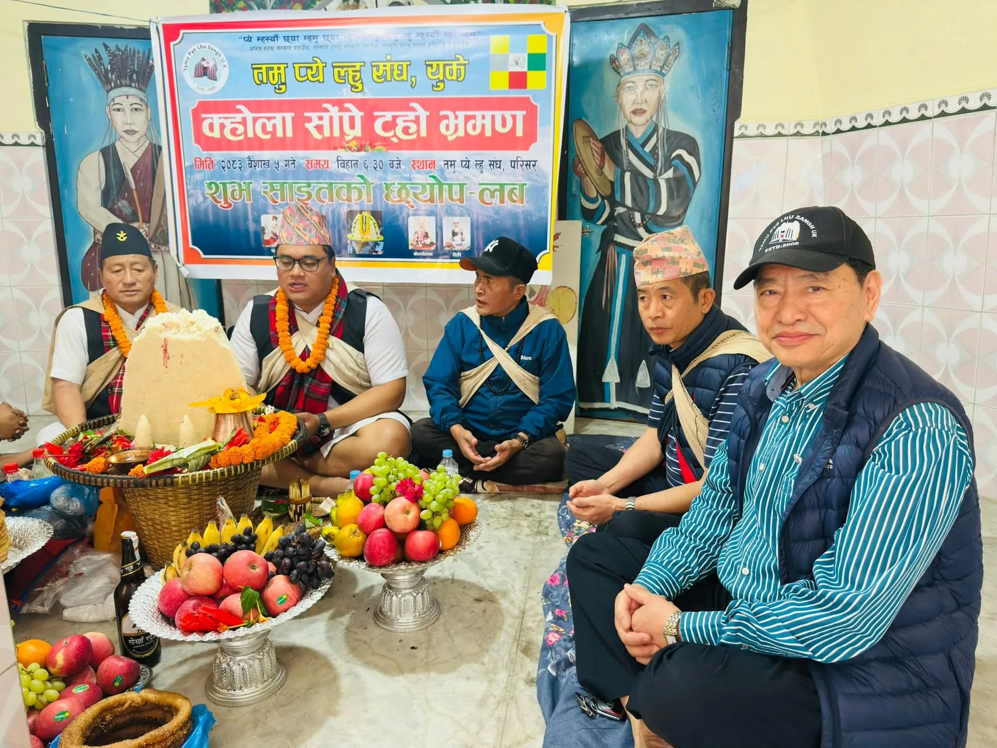 भ्रमण टोली भोलि ६ गते तमु प्ये ल्हु संघ केन्द्रीय फ.लि.ना. क्होइबो पोखरादेखी शुरु भइ लमजुङको भुजुङ हुँदै क्होला पुग्ने भ्रमण तालिका रहेकोले शुभसाइतका लागि आज बैशाख ५ गते ल्हेंगे पच्युद्वारा छ्योप पूजा गरी शुभयात्राको कामना गरेका छन् ।