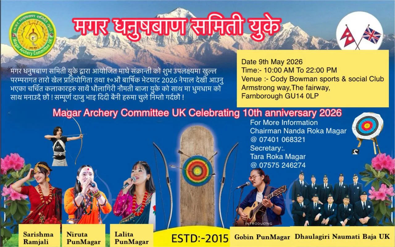 बेलायत – मगर धनुषबाण समिति युकेले आफ्नो १०औँ वार्षिकोत्सवको शुभ उपलक्ष्यमा एक भव्य सांस्कृतिक कार्यक्रम र खुल्ला परम्परागत तारो खेल प्रतियोगिता आयोजना गर्ने भएको छ। सन् २०१५ मा स्थापित यस समितिले आफ्नो एक दशकको गौरवमय यात्रालाई विशेष उत्सवका साथ मनाउने तयारी गरेको हो।