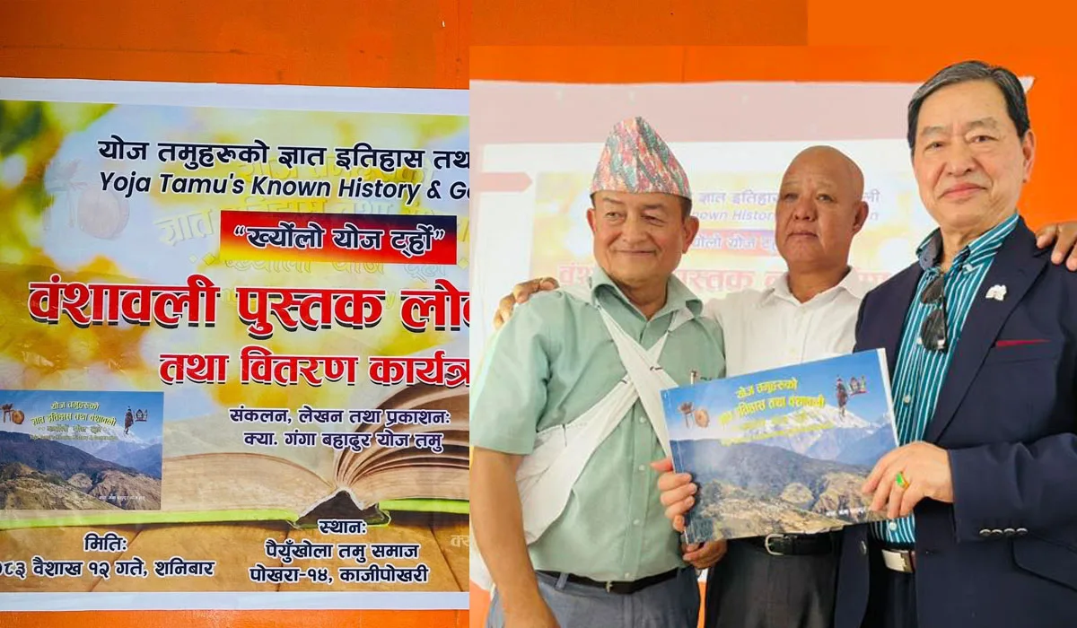 पोखरा । योज तमुहरुको ज्ञात इतिहास तथा वंशावली `ख्योंलो योज ट्हों´ पुस्तक लोकार्पण तथा वितरण कार्यक्रम २०८३ वैशाख १२ गते शनिबार, पोखरा-१४ काजीपोखरी हवेलीमार्ग स्थित पैयुँखोला तमु समाज भवनको सभाहलमा सम्पन्न भएको छ ।