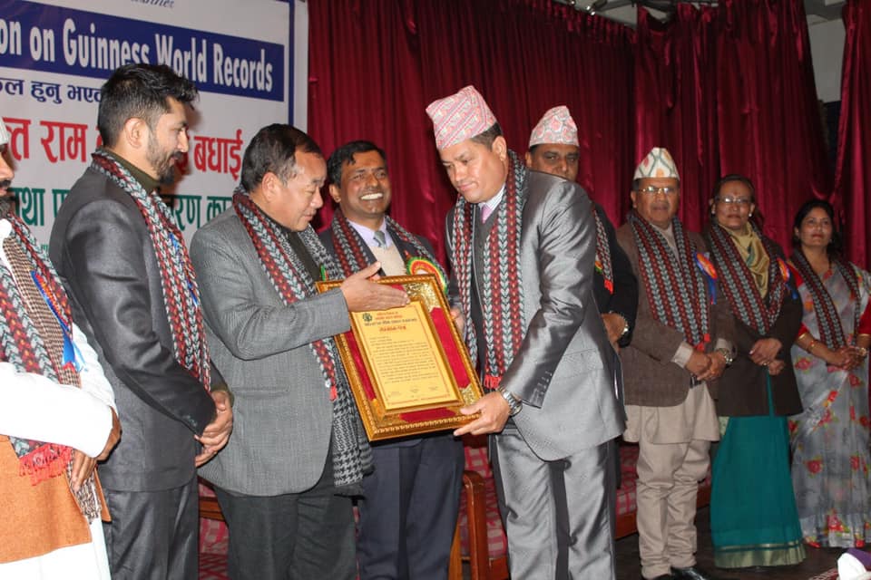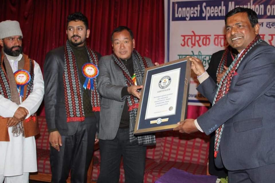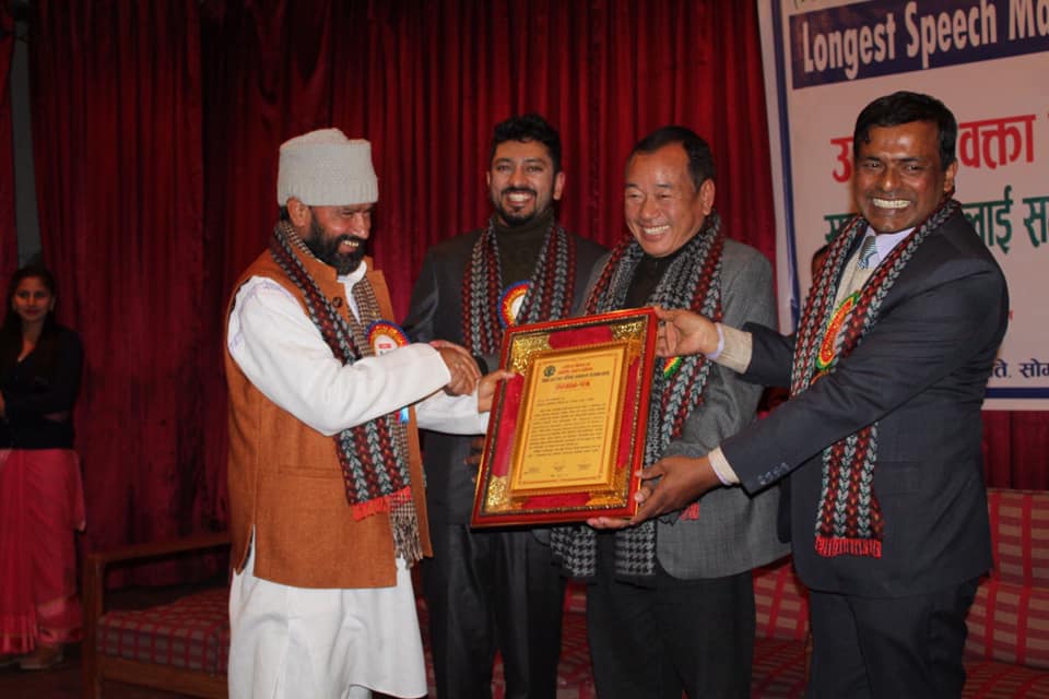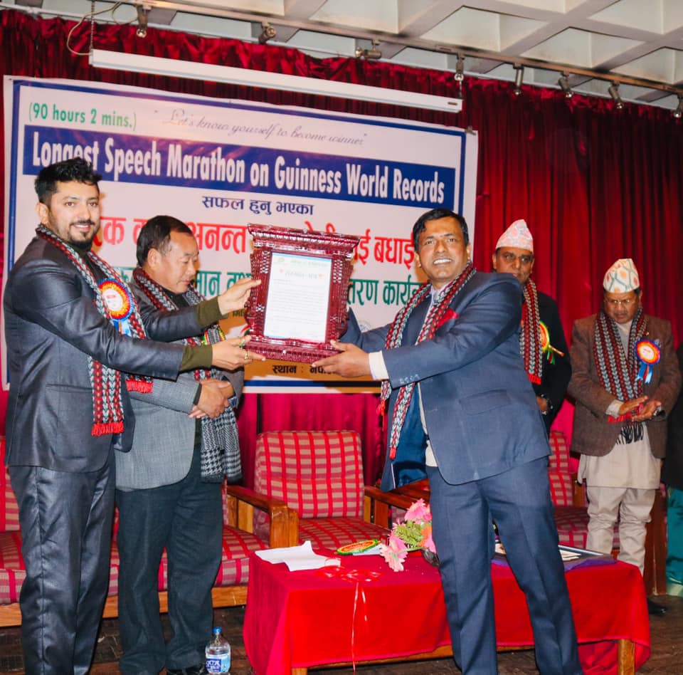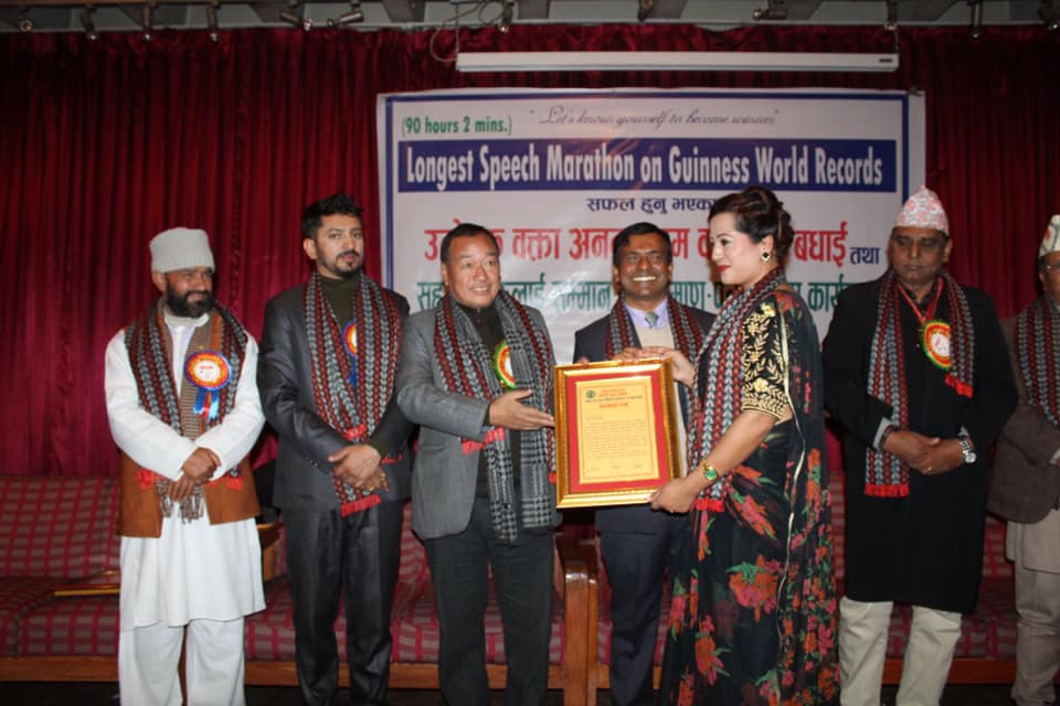 काठमाडौँ । लगातार ९० घण्टा दुई मिनेट भाषण गरेर ‘गिनिज वर्ल्ड’ कायम गर्न सफल अनन्तराम केसीलाई सोमबार यहाँ सम्मान गरिएको छ । व्यक्तित्व विकास मनोशक्ति जागरण अभियानले आयोजना गरेको कार्यक्रममा प्रतिनिधिसभाका सांसद हितबहादुर तामाङ र पूर्वपर्यटन तथा नागरिक उड्डयनमन्त्री आनन्दप्रसाद पोखरेलले केसीलाई संयुक्त रुपमा सम्मान गरे। कार्यक्रममा वर्ल्ड रेकर्डको प्रमाणपत्रस मेत सार्वजनिक गरियो।