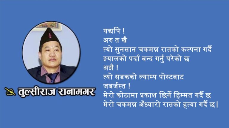 बाहिर निस्पट्ट, चकमन्न अँध्यारो होस् पारि जङ्गलतिर स्याल कराइरहोस् आकाशमा बिजुली चम्कियोस् आकाश गर्जिँदै मूसलधारे वर्षा होस् झाडीतिर भ्यागुटोको ट्वार-ट्वार सुन्न पाइयोस् पानीका बुदहरु घरका छानामा बज्रिरहोस् बलेनीबाट झरेका पानी बलेसी हुँदै खोल्सीतिर बुर्कुसी मार्दै