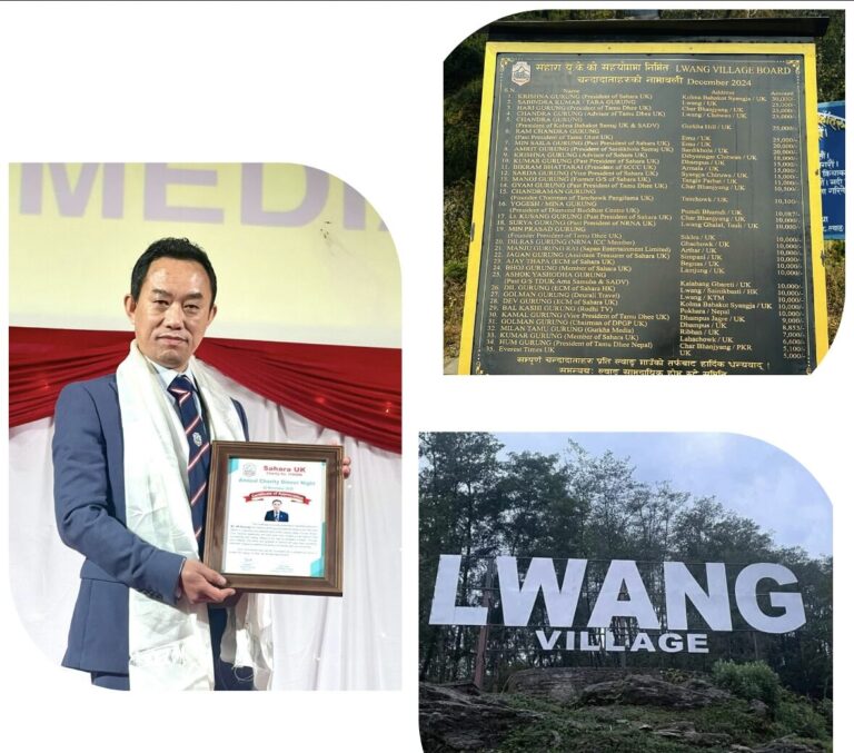 लण्डन, युके – सहारा यूकेद्वारा २२ नोभेम्बर २०२५मा आयोजित वार्षिक च्यारिटी डिनर नाइटका अवसरमा ल्वाङ गाउँ (Lwang Village) पर्यटन बोर्डको स्थापना तथा सञ्चालनमा महत्वपूर्ण भूमिका निर्वाह गर्ने श्री एस.के. गुरुङलाई विशेष सम्मान प्रदान गरिएको छ।