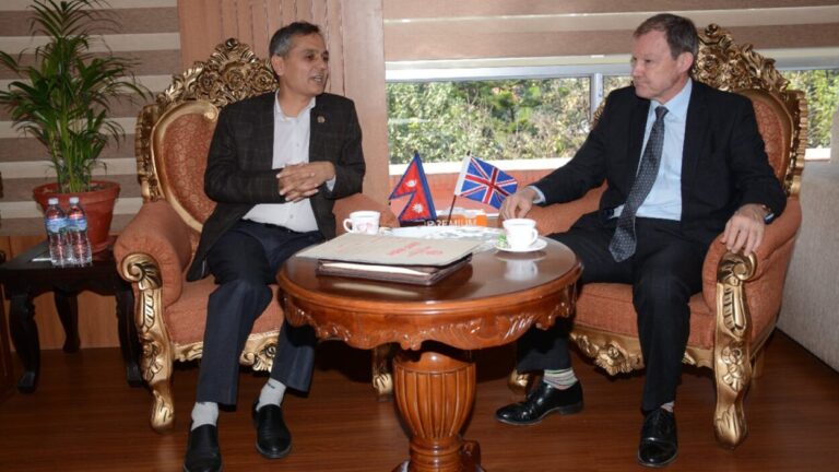 काठमाडौँ १४ नोभेम्बर २०२५ । नेपालका गृहमन्त्री ओमप्रकाश अर्यालसँग नेपालका लागि बेलायती राजदूत रोब फेनले शिष्टाचार भेटवार्ता गरेका छन् । गृह मन्त्रालयमा शुक्रबार भएको भेटमा उनीहरूबीच पछिल्लो परिवर्तित राजनीतिक परिस्थितिबारे विमर्श भएको गृहमन्त्रीको सचिवालयले जनाएको