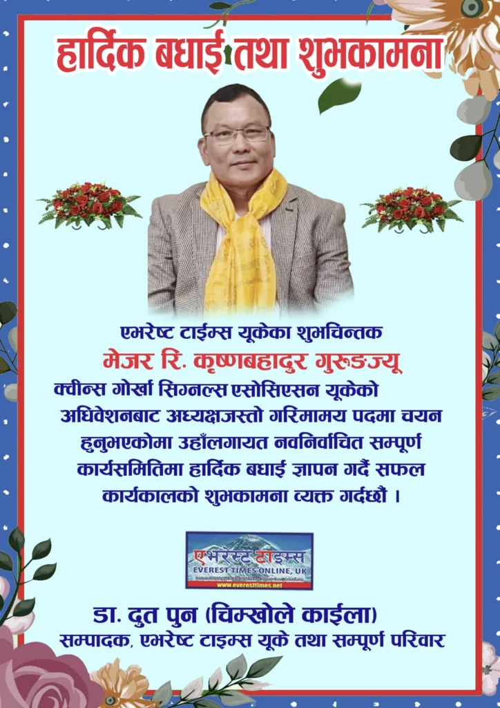 बेलायत – मेजर कृष्ण गुरुङ क्विन्स गोर्खा सिग्नल्स एसोसिएसन युकेको अध्यक्षमा निर्वाचित हुनुभएको छ। गत शनिबार, ४ अप्रिल २०२६ मा बेलायतको नर्थहोल्टस्थित नर्थहोल्ट कम्युनिटी सेन्टरमा सम्पन्न संस्थाको वार्षिक साधारण सभा तथा अधिवेशनले उहाँलाई नयाँ नेतृत्व चयन गरेको हो। एसोसिएसनका सचिव किरण लिम्बुले सञ्चालन गर्नुभएको उक्त साधारण सभाको सभापतित्व मेजर नविन्द्र विक्रम गुरुङ (MBE) ले गर्नुभएको […]