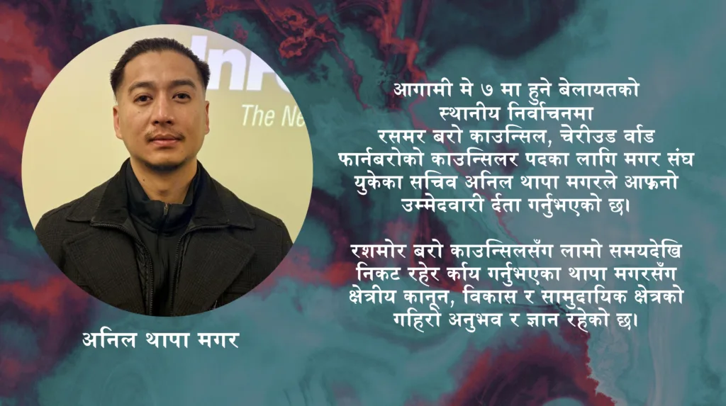 प्रस्तुति: चिम्खोले काईला – बेलायत। आगामी मे ७ मा हुने बेलायतको स्थानीय निर्वाचनमा रसमर बरो काउन्सिल, चेरीउड वार्ड फार्नबरोको काउन्सिलर पदका लागि मगर संघ युकेका सचिव अनिल थापा मगरले आफ्नो उम्मेदवारी दर्ता गर्नुभएको छ। रशमोर बरो काउन्सिलसँग लामो समयदेखि निकट रहेर कार्य गर्नुभएका थापा मगरसँग क्षेत्रीय कानून, विकास र सामुदायिक क्षेत्रको गहिरो अनुभव र ज्ञान […]