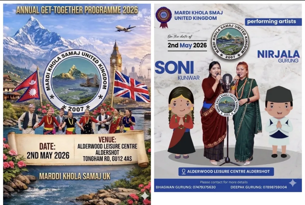 लण्डन SK — मर्दीखोला समाज यूकेको आयोजनामा आगामी २ मे २०२६ मा अल्डरशटस्थित एल्डरवुड लेजर सेन्टरमा वार्षिक भेटघाट तथा विशेष सांगीतिक कार्यक्रम आयोजना हुने भएको छ। कार्यक्रममा चर्चित कलाकार सोनी कुँवर र निर्जला गुरुङले आफ्नो आकर्षक प्रस्तुति दिने कार्यक्रम रहेको आयोजकले जनाएको छ। उनीहरूले नेपाली परम्परागत तथा आधुनिक गीत–संगीत प्रस्तुत गर्नेछन्, साथै समाज को सदस्य […]